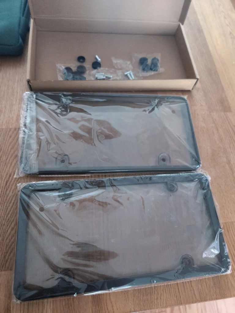 Selling a set of brand new black license plate frames. They come with all the necessary hardware for installation, and the box is included