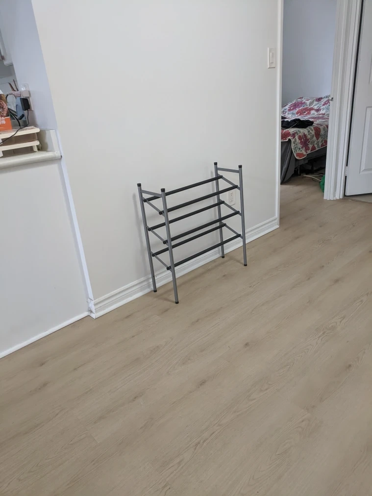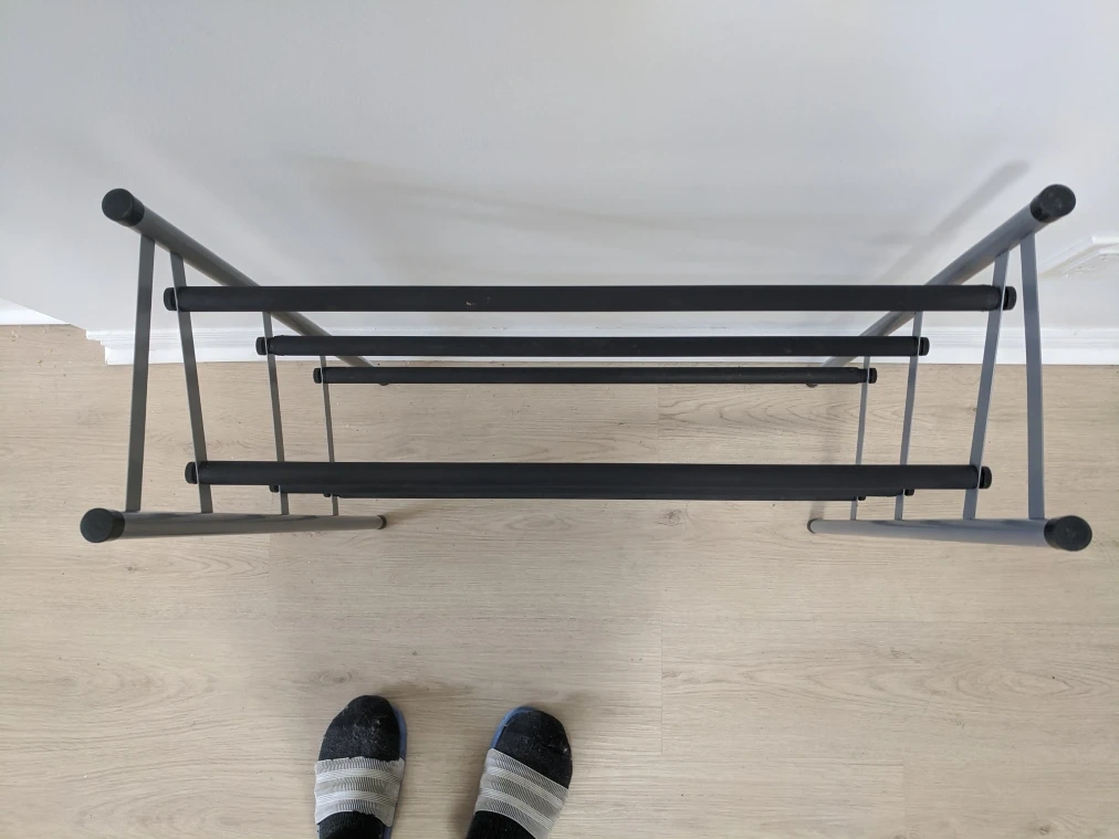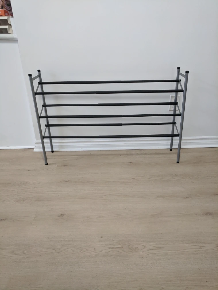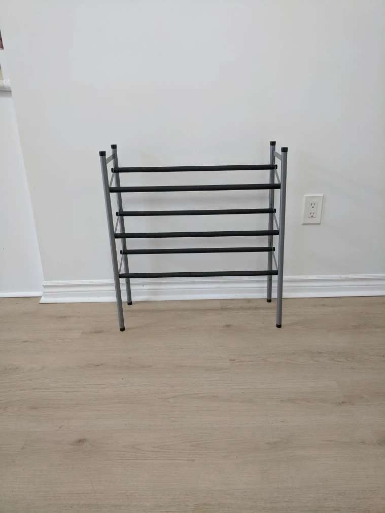 Selling a simple shoe rack, perfect for tidying up your entryway or closet! It's a grey metal frame with black bars for the shoes to rest on. Great for keeping your shoes organized and off the floor.