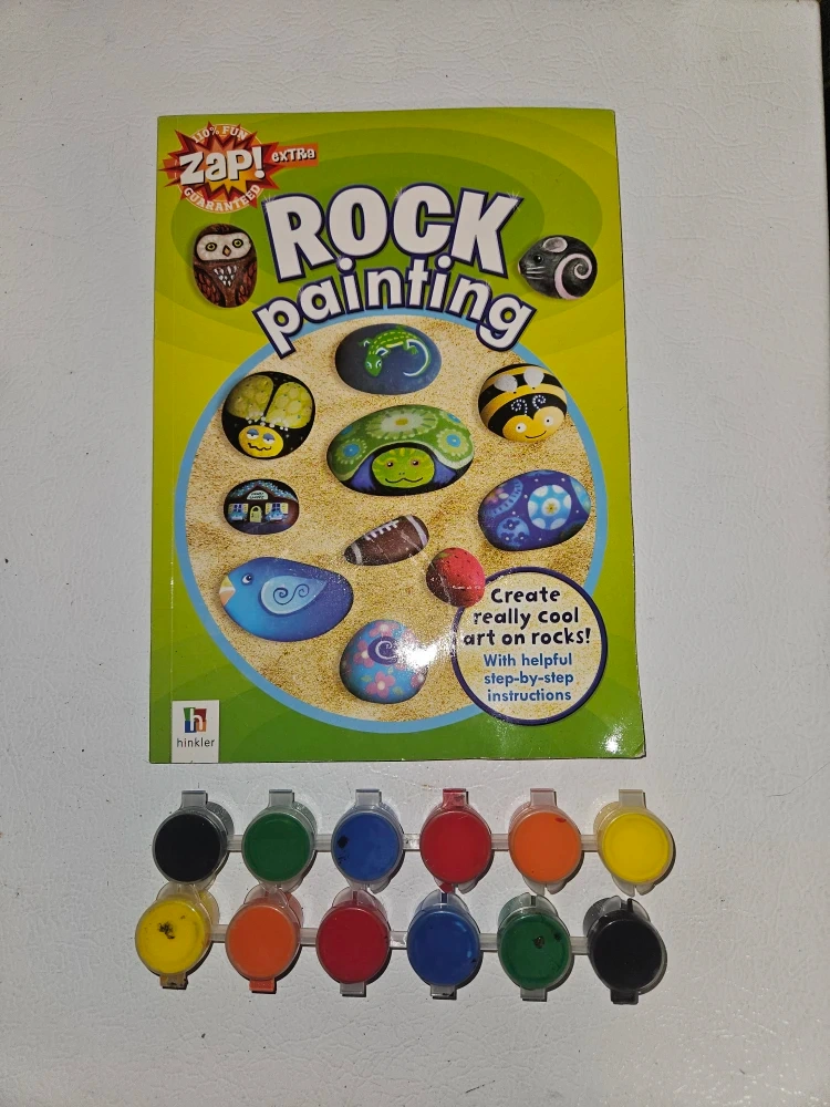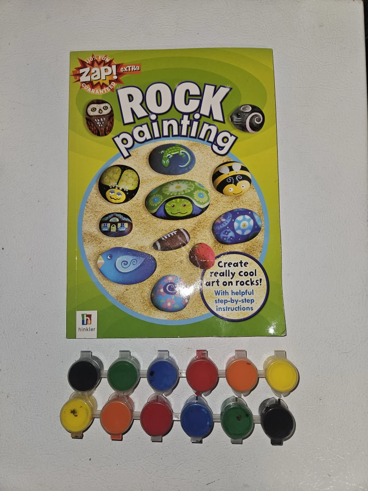 Get creative with this Zap! Extra Rock Painting kit! It comes with everything you need to create really cool art on rocks, including helpful step-by-step instructions and a variety of paints. Note: Book is like new, paints may be dried up but you probably have some or can buy a set at the dollar store :)