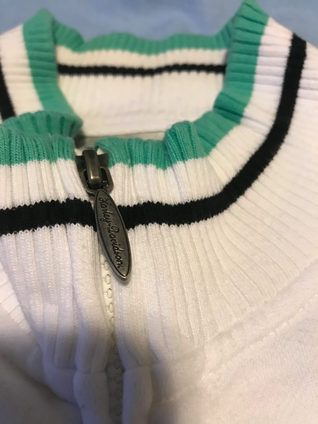 Selling a Harley Davidson jacket in white with green and black accents. It's a size XL and features the Harley Davidson logo on the front and back. Perfect for any Harley enthusiast!