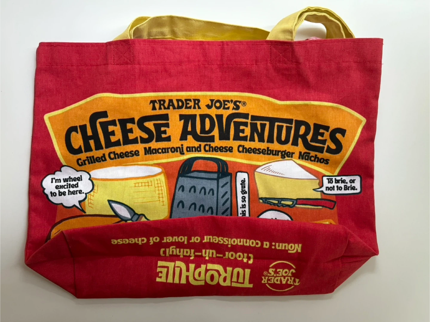 I'm selling a Trader Joe's 100% cotton reusable bag featuring a fun cheese theme!