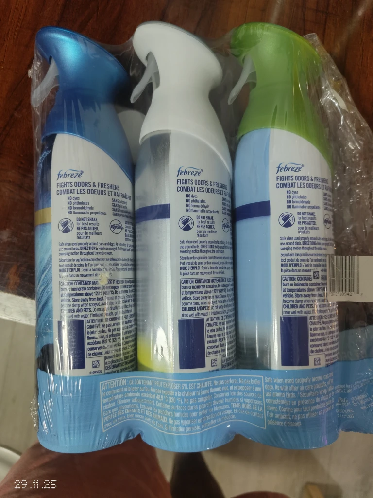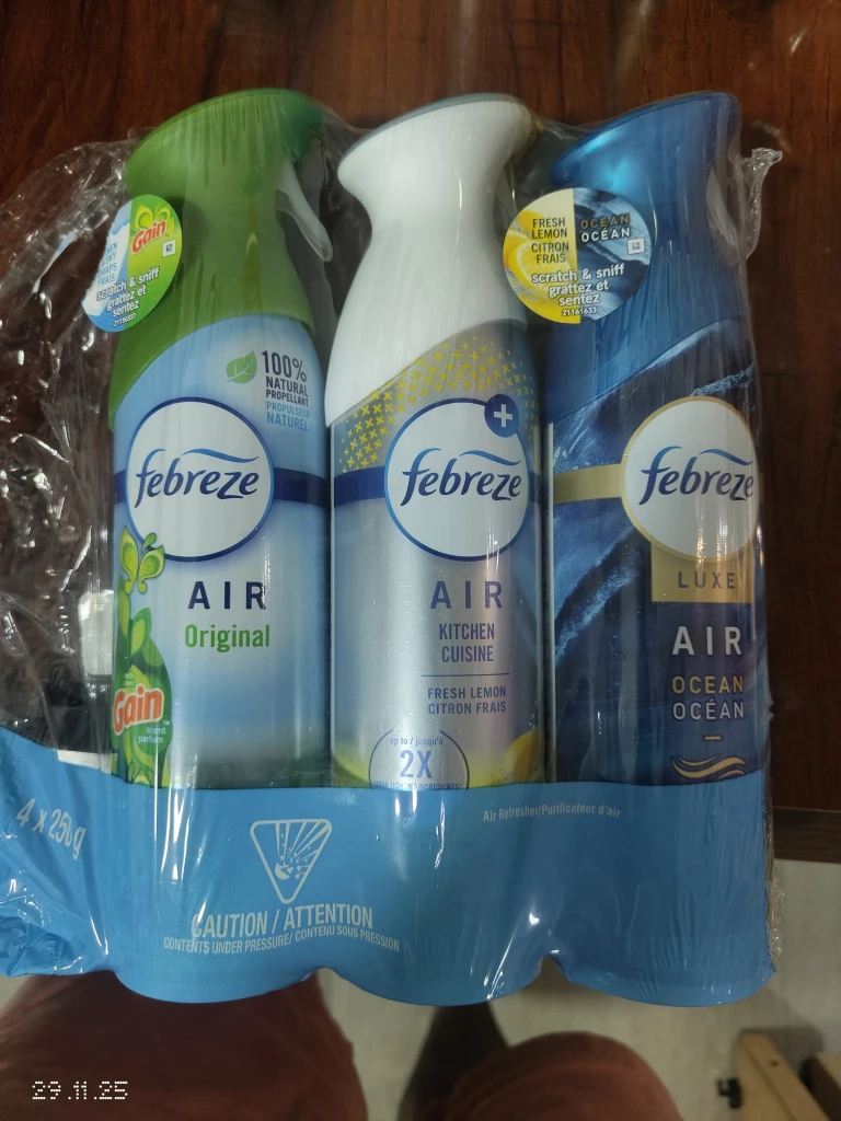 Selling a 3pack of Febreze air fresheners! It includes Original, Kitchen Cuisine Fresh Lemon, and Ocean scents. These fight odours and freshen the air. Perfect for keeping your home smelling great!