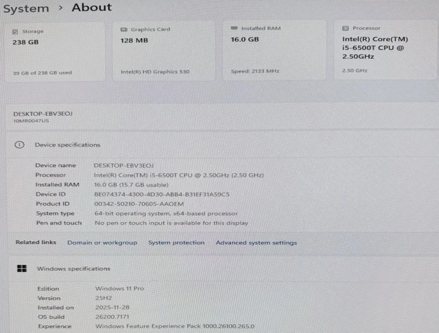 Lenovo M710q Micro PC - i5-6500T 16GB Ram 256GB SSD WiFi