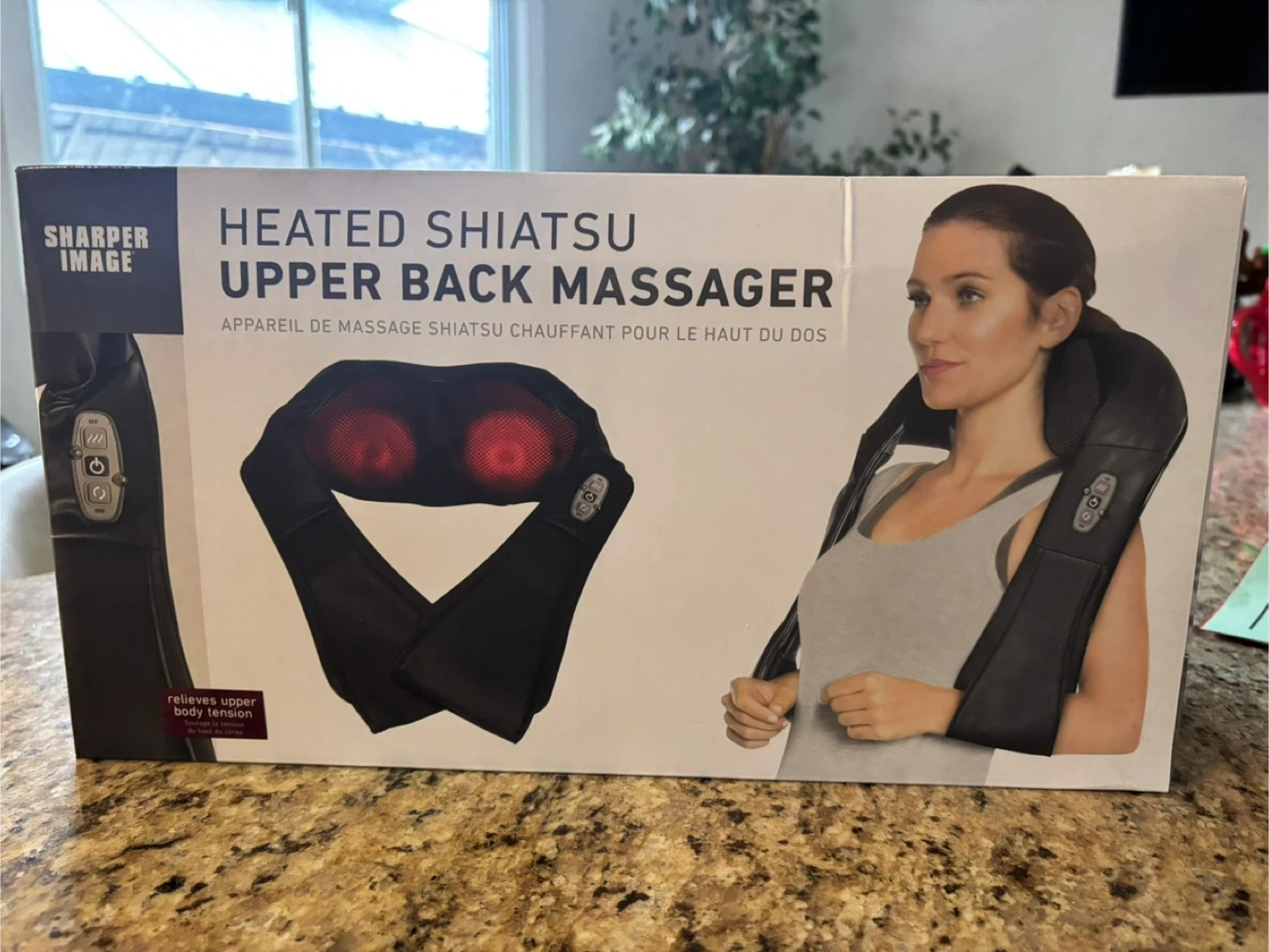 I'm selling a Sharper Image Heated Shiatsu Upper Back Massager! It features four rapid-pulsing, bidirectional massage nodes to promote soothing relaxation. The easy-to-use control panel makes it simple to massage your neck, back, shoulders, and more! You can pair the heat function with one of four Shiatsu-inspired massage modes, and make use of the 15-minute timer to manually operate the massager. Included in the box is the Heated Shiatsu Upper Back Massager, Power Adapter, and User Manual