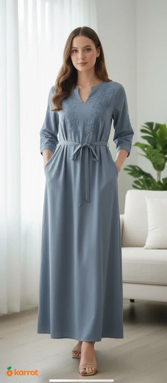 Here's a lovely blue maxi dress with delicate floral embroidery! It features 2 pockets and a comfortable tie waist. Perfect for a casual day out or a special occasion. It is in great condition!