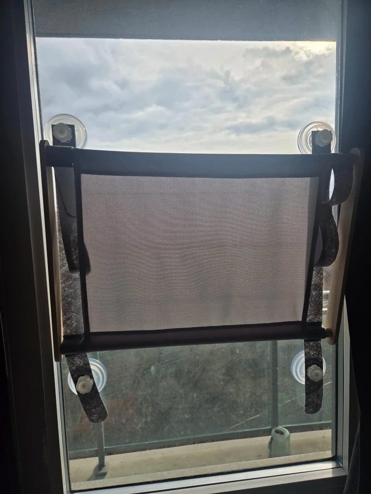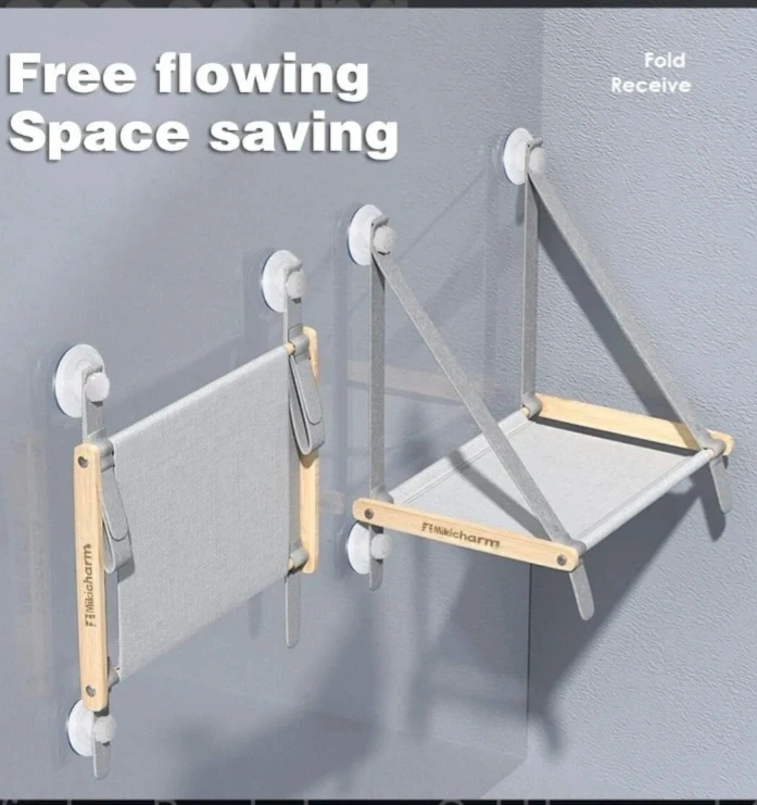 This is a Mikicharm cat hammock that mounts to the window with suction cups. It's a great space-saving option for your feline friend. It's designed to be free-flowing and easy to fold and receive. Custom suction cups provide enhanced suction. The frame is made of solid wood.