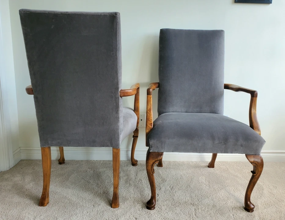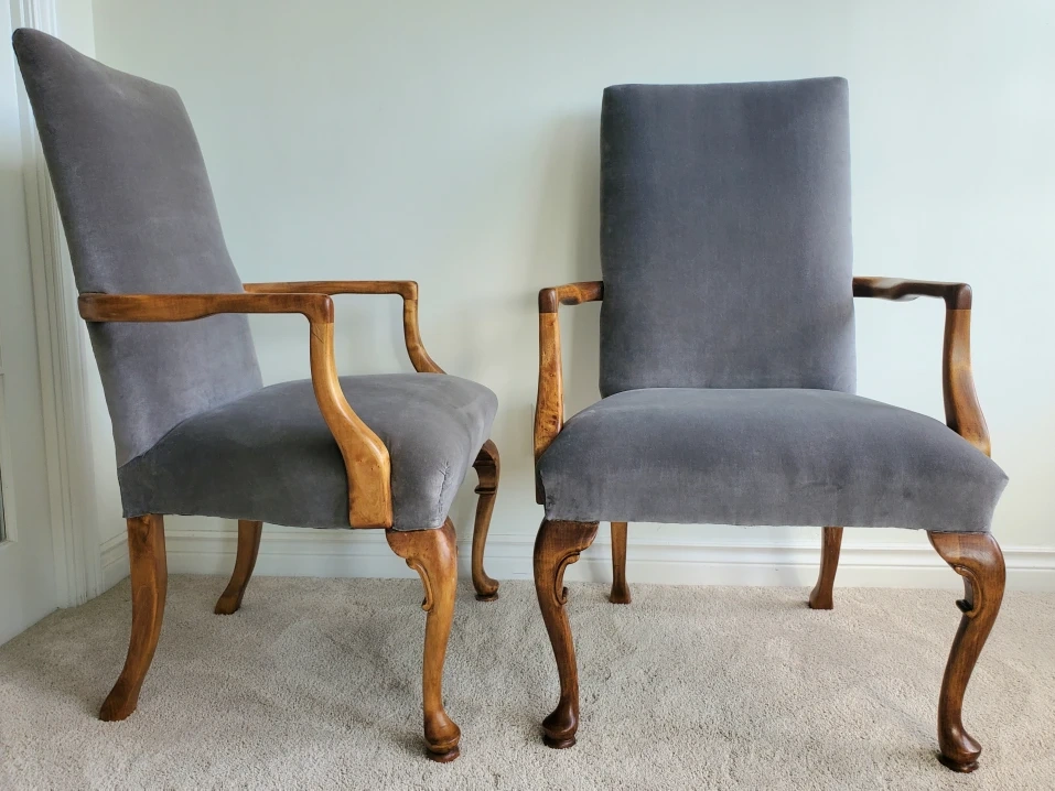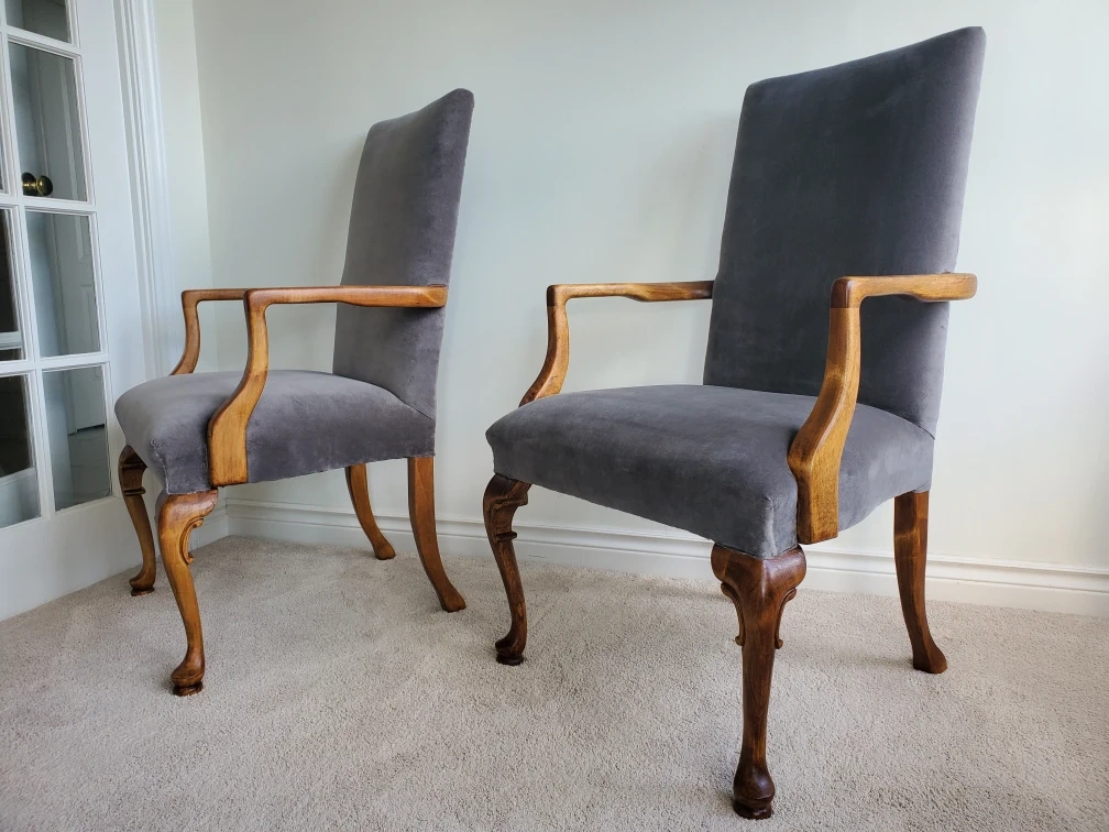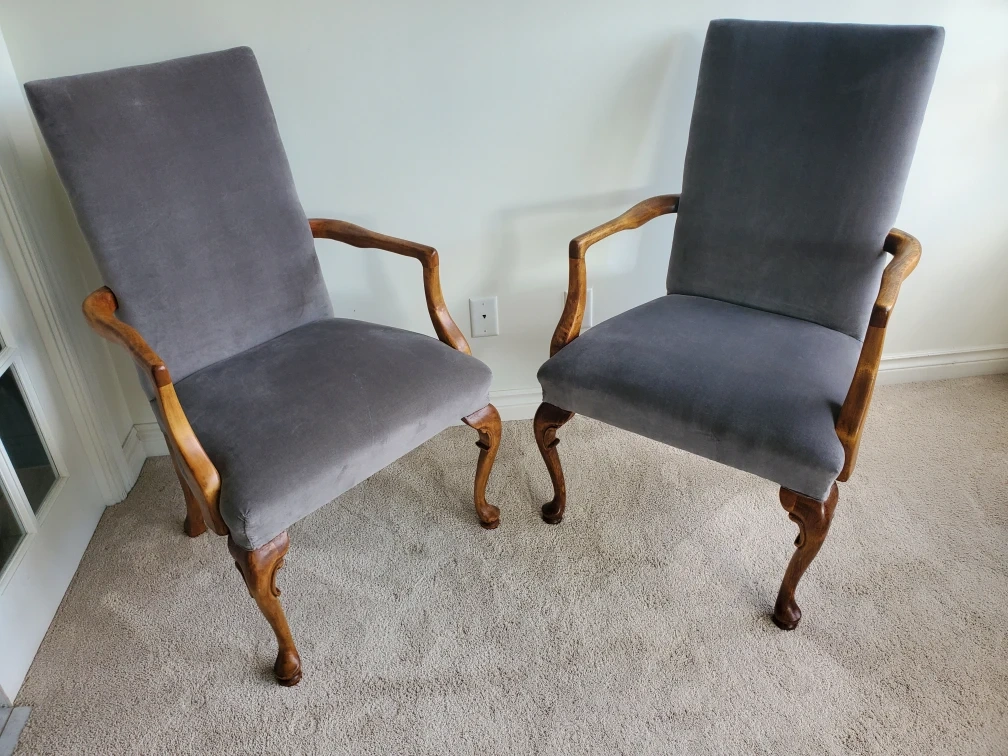 A pair of elegant classic vintage armchairs in excellent condition. New foam, new upholstery in grey velvet, very sturdy and comfortable, beautifully carved wood arms and legs. 26" wide x 21" deep x 42" tall back, 18.5" seat height. No issues or damage.
