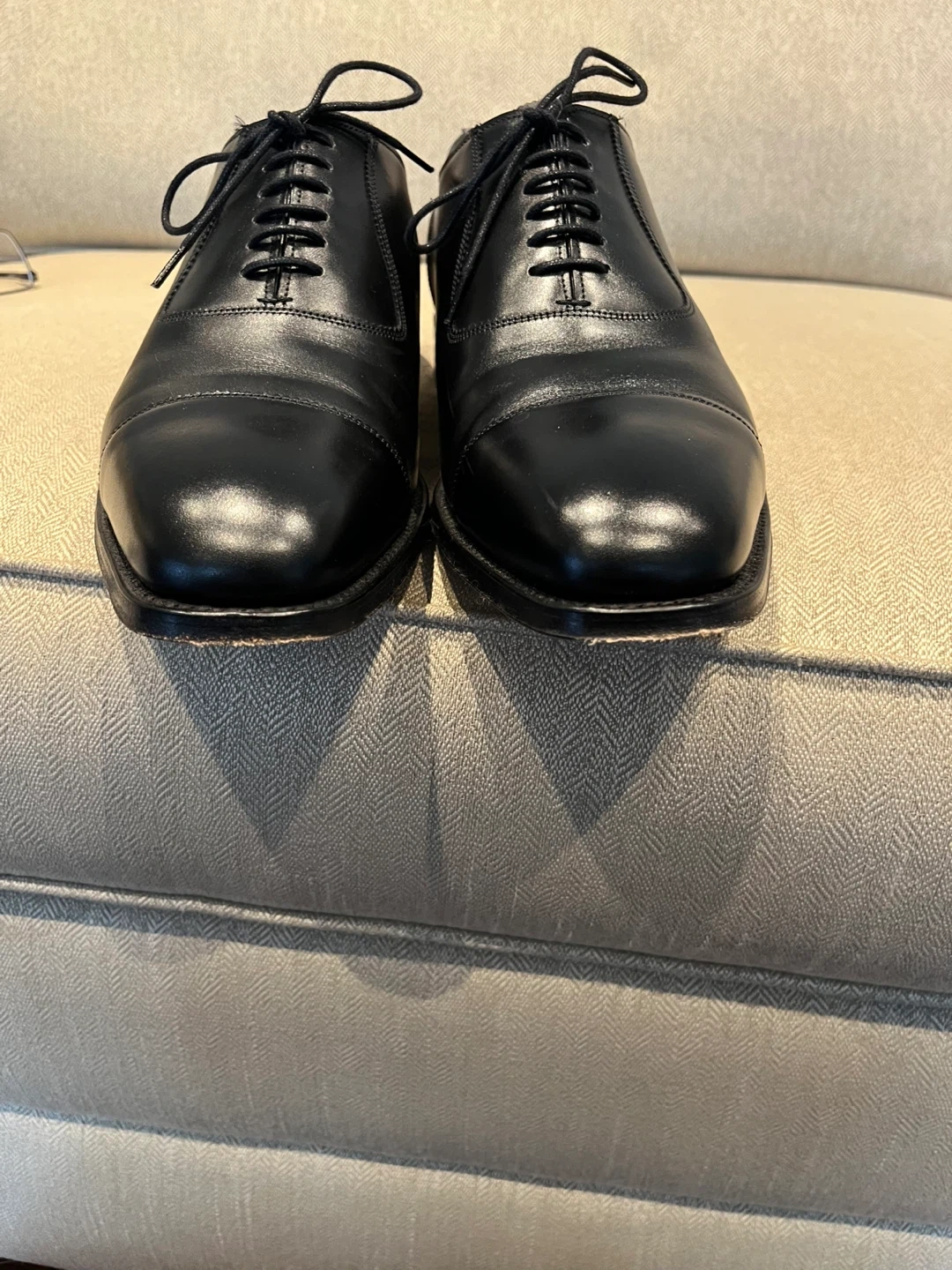 Brackley Oxford in Black Calf Leather. Joseph Cheaney & Sons Handmade shoes. Made in England Features include a 6 eyelet oxford fastening and stitched toe cap. 225/F size UK 8