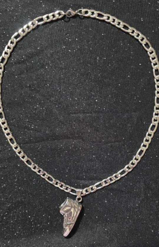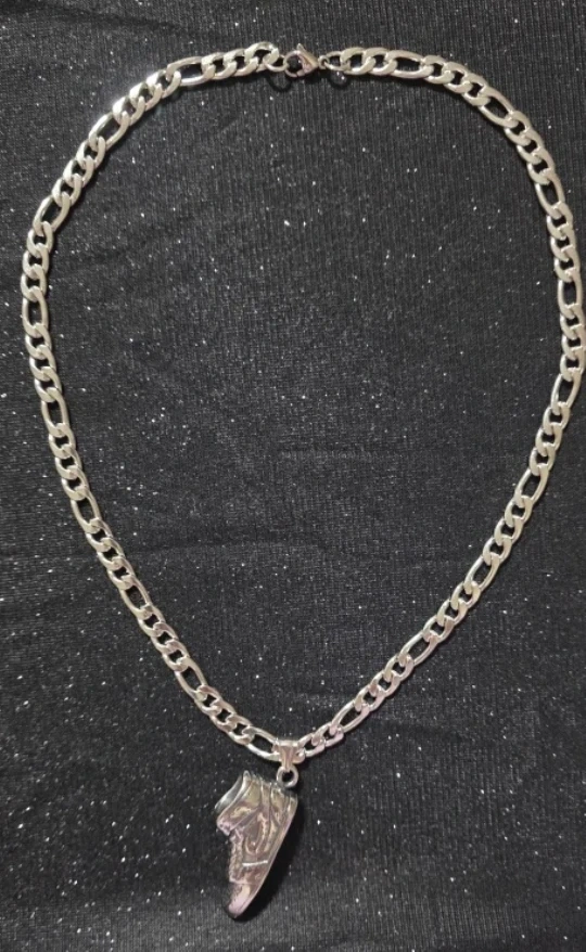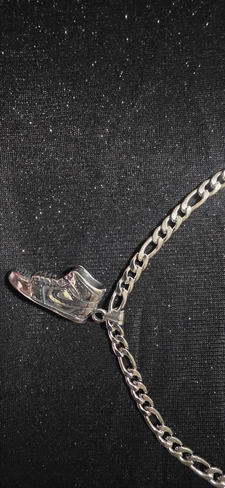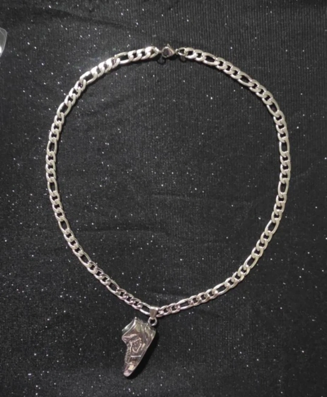 Here's a cool silver chain necklace featuring a miniature Air Jordan 1 sneaker pendant! It's a stylish and unique accessory for any sneakerhead or fashion enthusiast