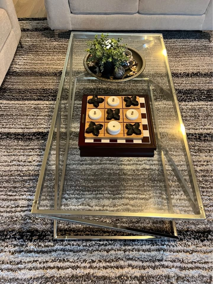 Add a touch of elegance to your living space with this stylish modern coffee table. It features a thick tempered glass top paired with a sleek chrome geometric metal base, giving it a clean, contemporary look that suits any décor.