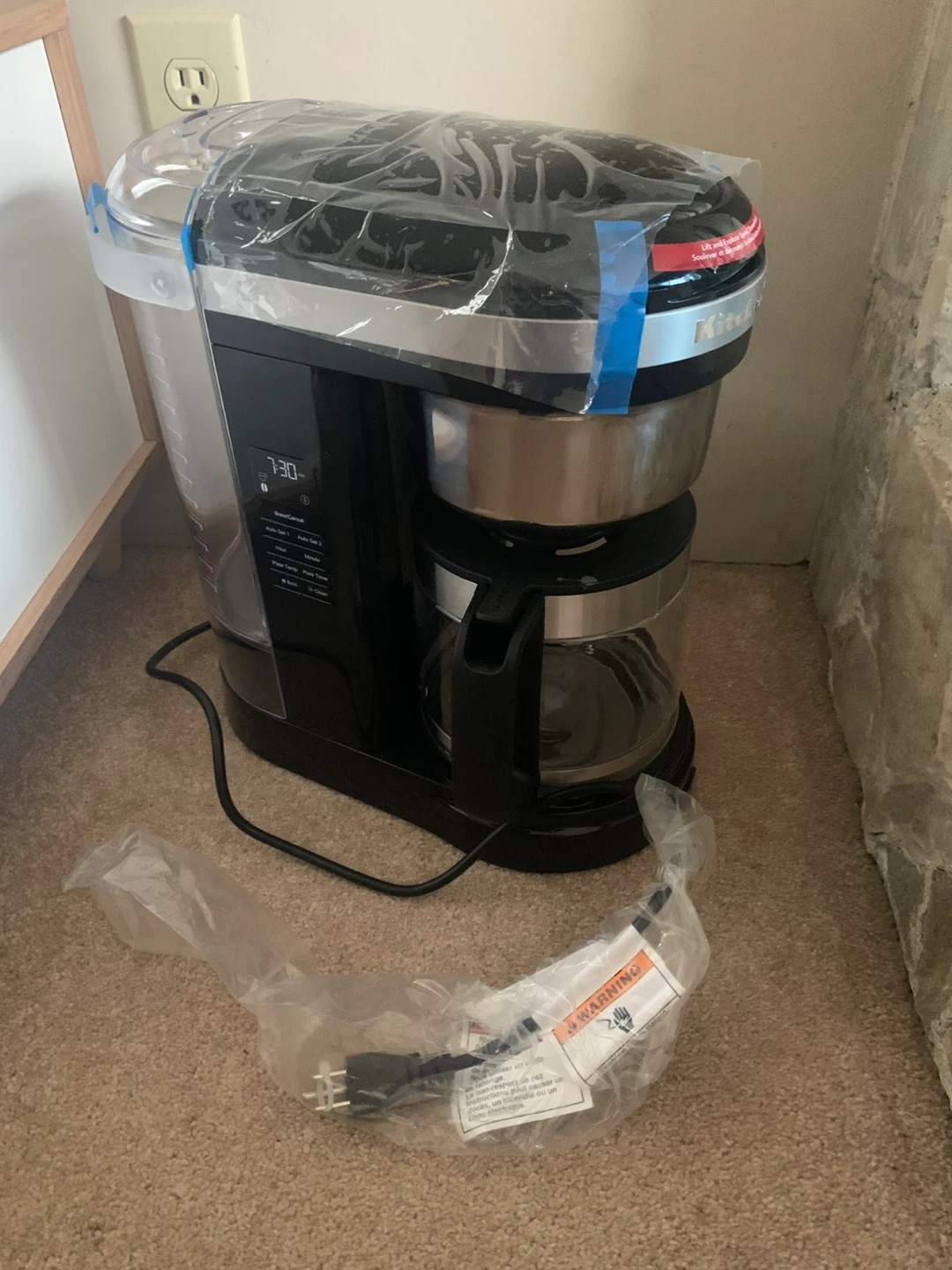 Selling a KitchenAid coffee maker that is still in its original packaging! It's black and silver and comes with the power cord.