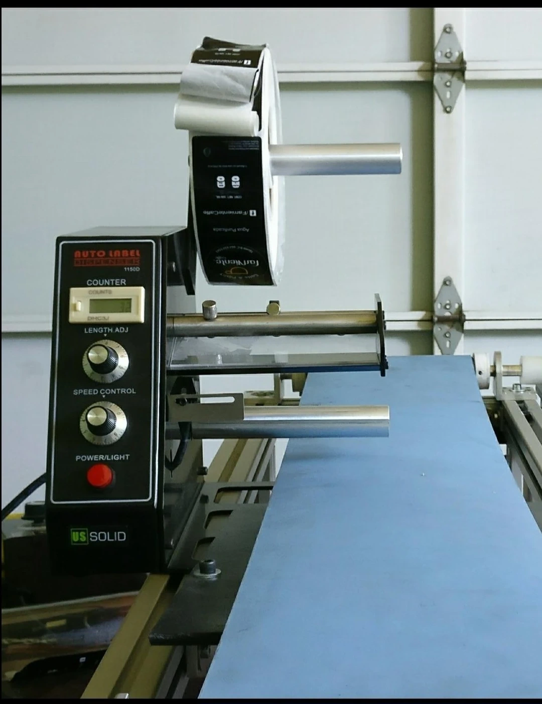 Selling a US Solid Auto Label Dispenser model 1150D. It features a counter, length adjustment, speed control, and a power/light button. Great for dispensing labels quickly and efficiently!
