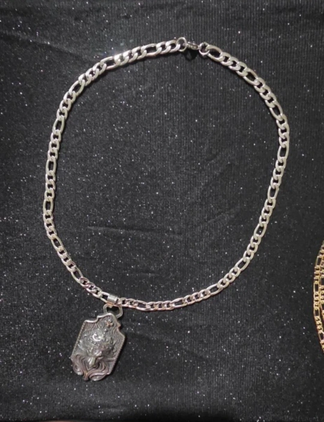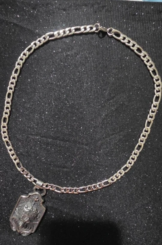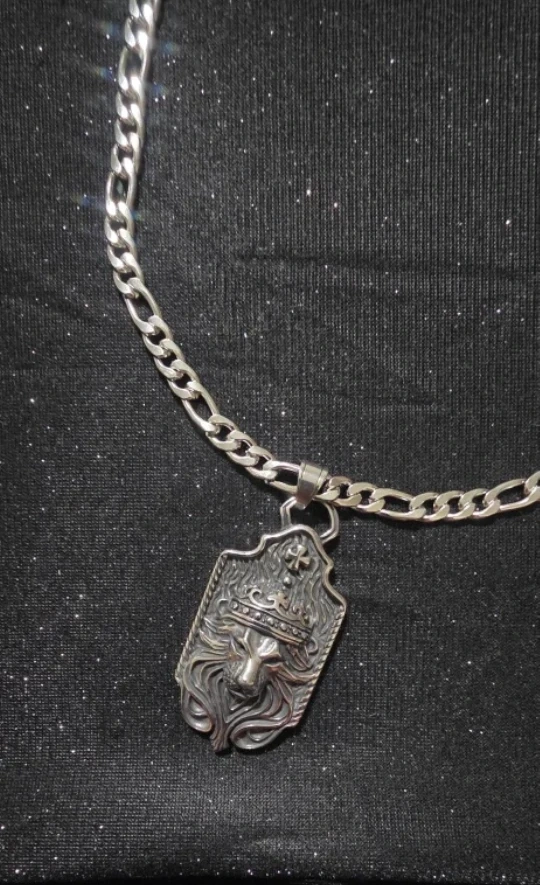 Selling a silver-colored necklace with a lion pendant. The pendant has a detailed design of a lion wearing a crown. The chain is a classic figaro style. It's a cool piece to add to your jewelry collection!
