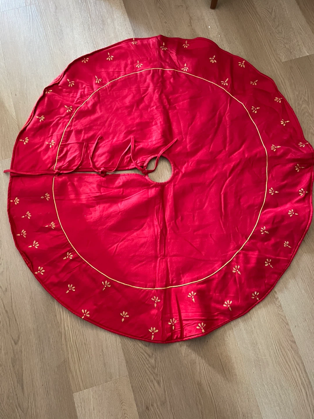 Add a festive touch to your holiday decor with this lovely large red Christmas tree skirt! It features gold accents and is in great condition. Perfect for completing your Christmas tree setup this season
