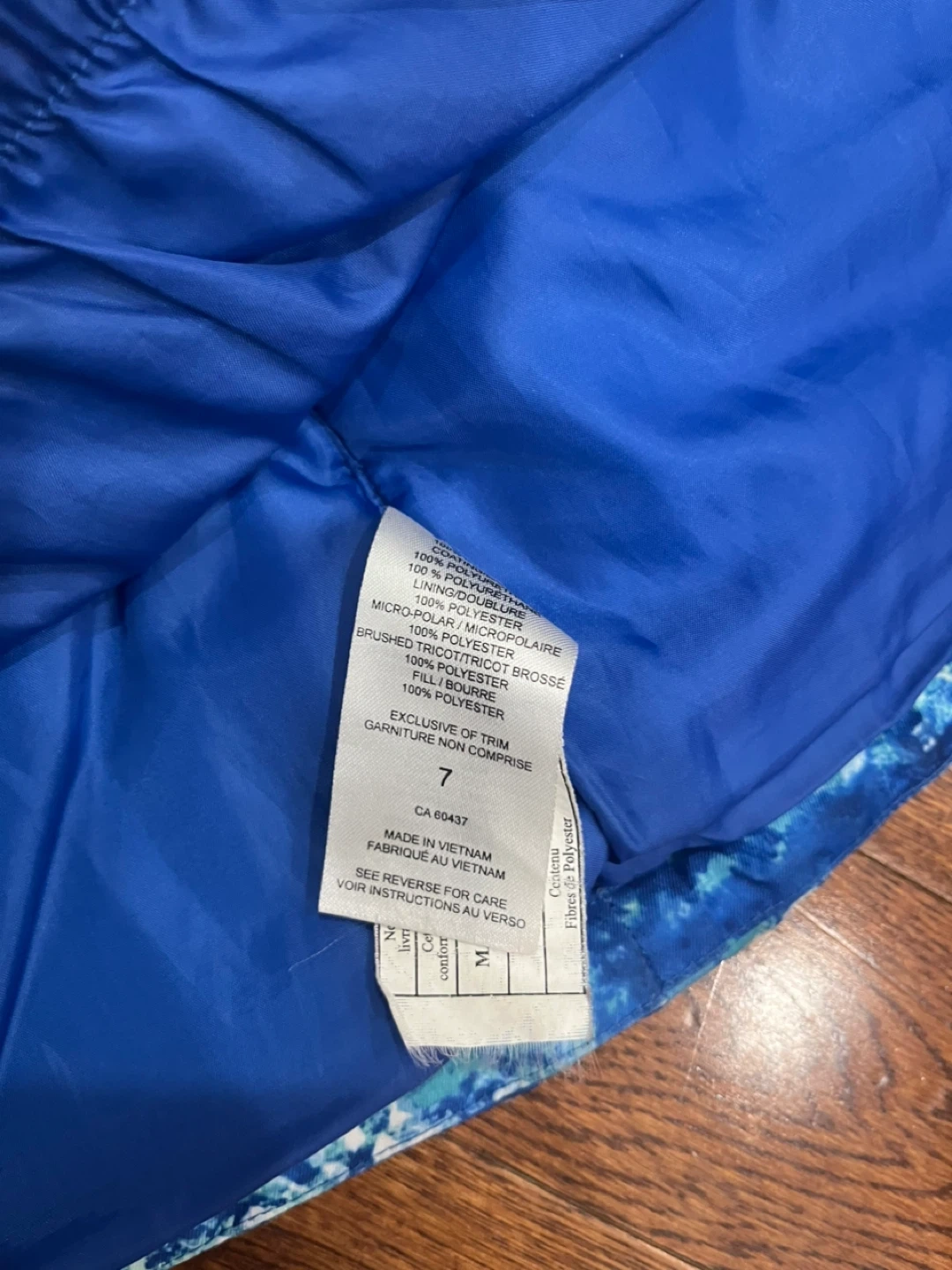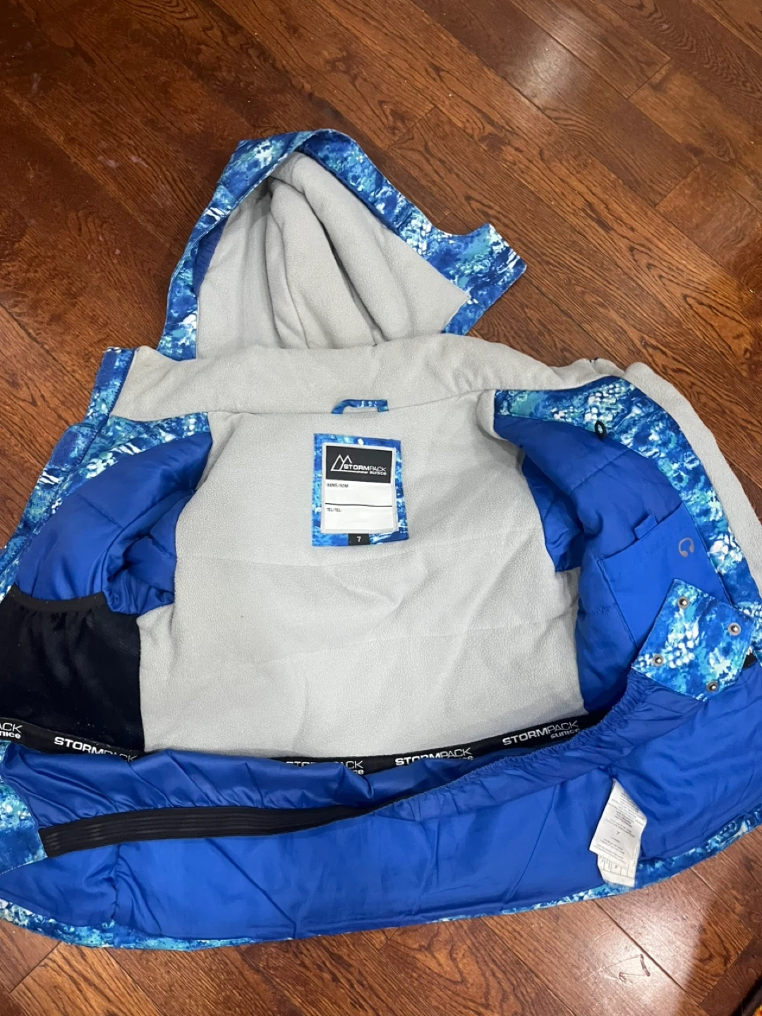 Selling a Stormpack snow pants so 6 and jacket set in size 7! The jacket features a blue pattern, while the pants are a solid blue with black accents. Both are made of 100% polyester. Bought from Costco