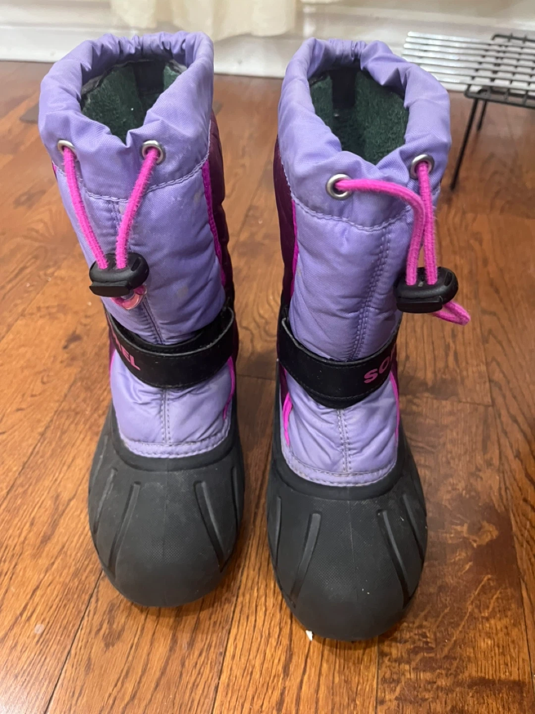 Size Youth 1. These Sorel kids' snow boots are in great condition and ready for some winter fun! They feature a stylish purple and pink colour scheme with a black sole. Perfect for keeping little feet warm and dry during snowy days! Pick up near Medowvale Town Center. Thanks