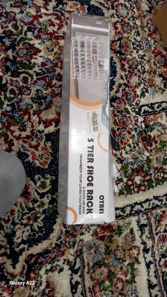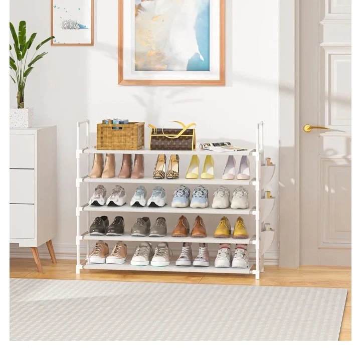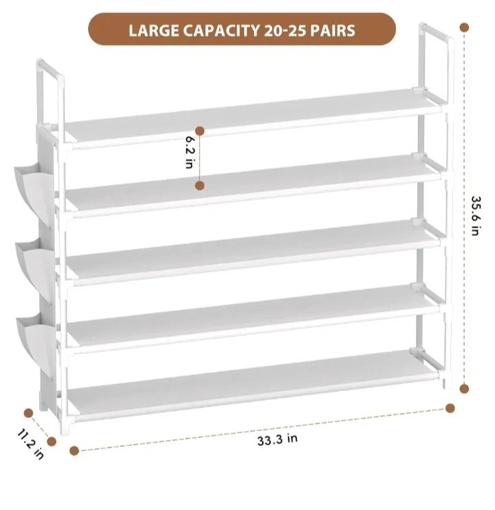Keep your footwear organized with this Oyrél 5-tier shoe rack! It's perfect for decluttering your entryway or closet. The rack is white and can hold approximately 20-25 pairs of shoes.