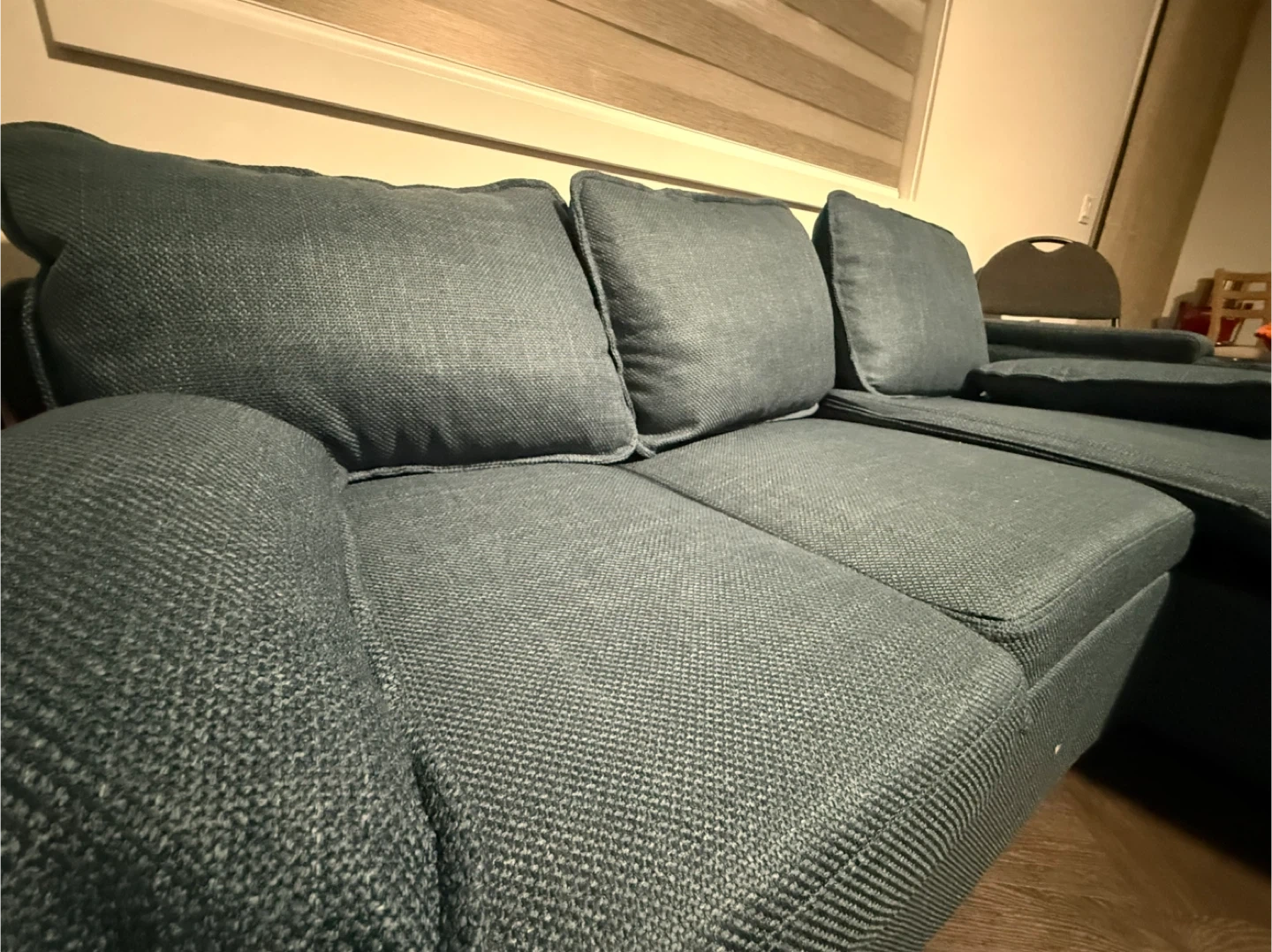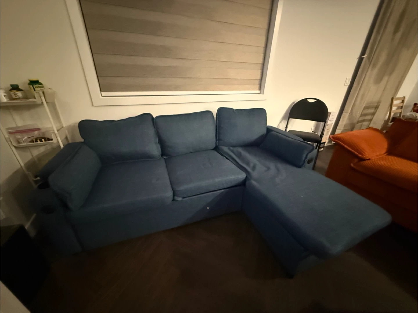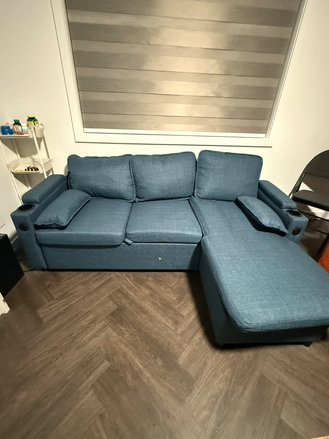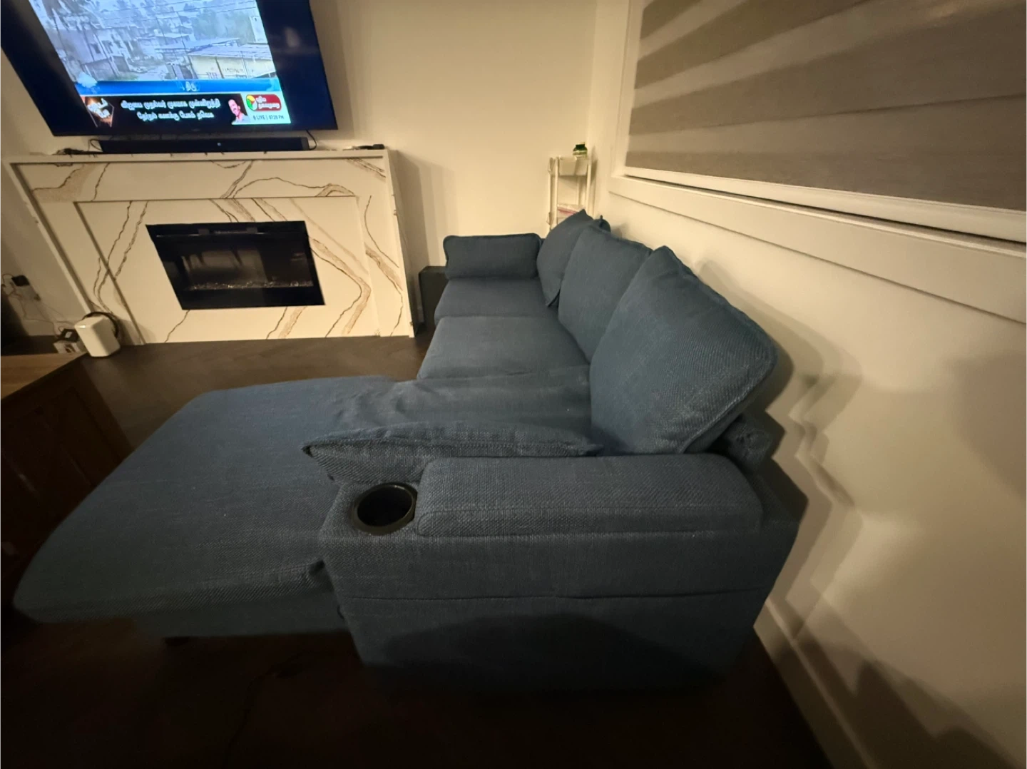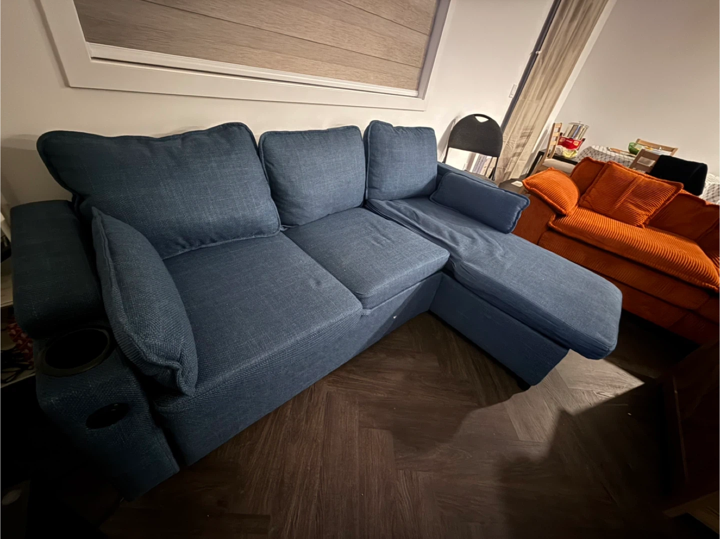 Selling a comfy blue sectional sofa! It features a chaise lounge for extra relaxation and handy cup holders on the armrests. It’s in great condition and ready for a new living space