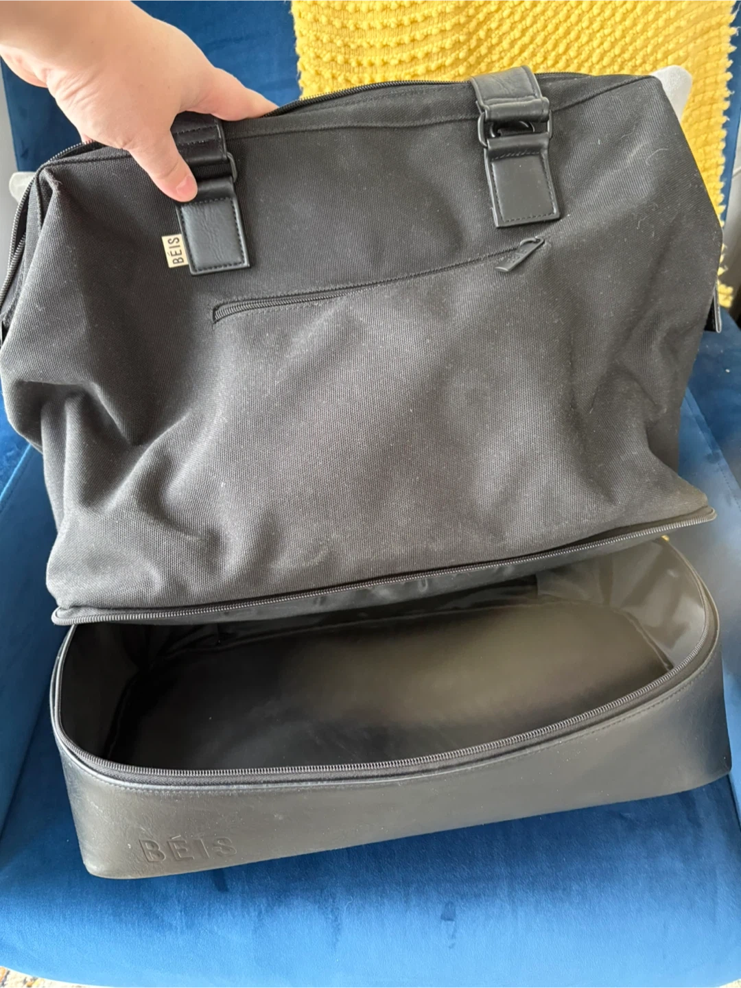 Selling a black Béis travel or gym bag. It's in great condition and ready for your next adventure or workout! It features a spacious interior and a separate compartment at the bottom for shoes or other items you want to keep separate. Perfect for weekend trips or gym visits