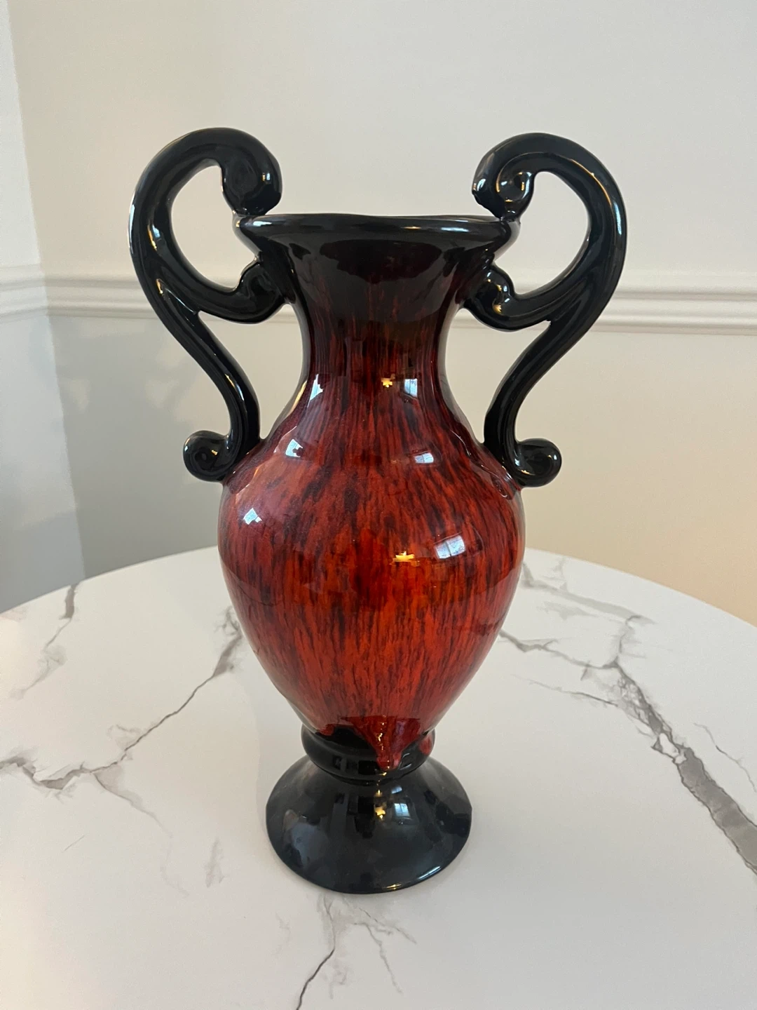 This is a beautiful decorative vase featuring a striking red and black colour scheme. It has two elegant handles and would make a lovely addition to any home decor