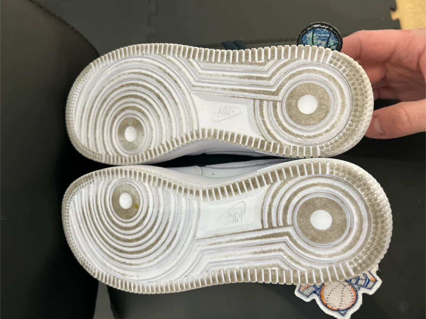 Selling a pair of Nike Air Force 1s in size 3.5Y. They show some signs of wear on the soles, but the uppers are in good condition. The shoes have been customized with Knicks and Nike basketball patches.