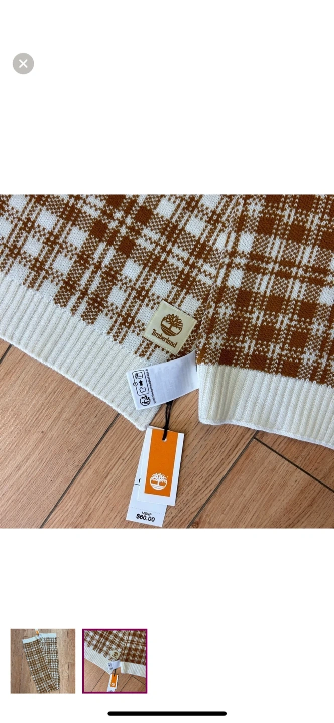 Timberland brand. Knit rectangle scarf. White & brown plaid. Brand new with tags