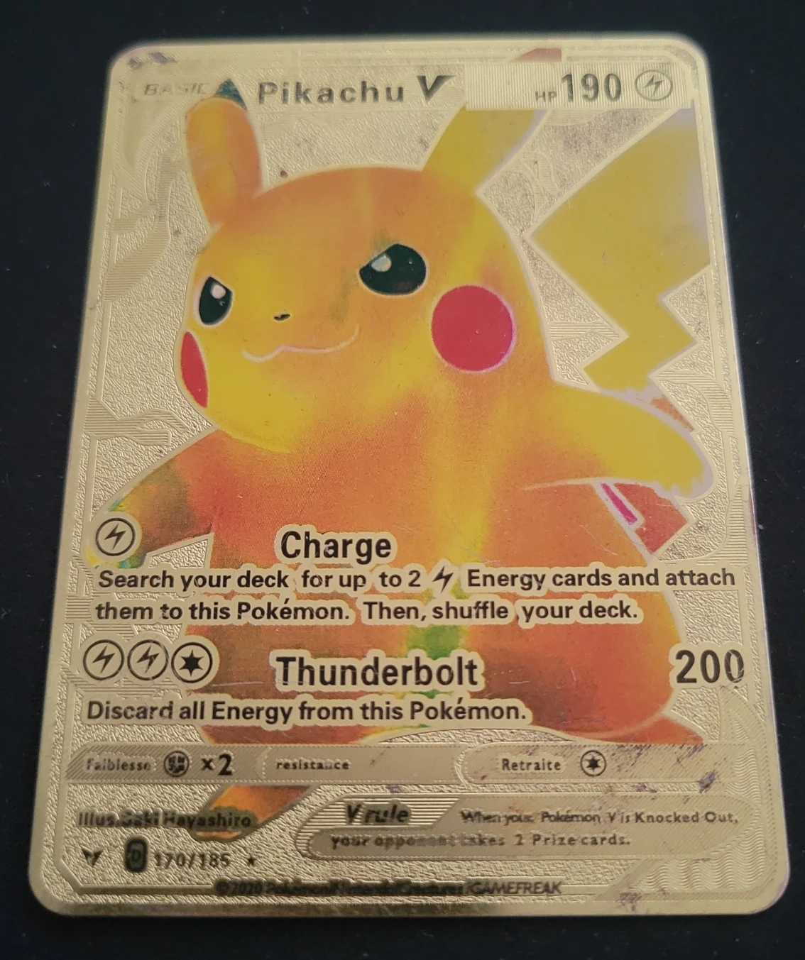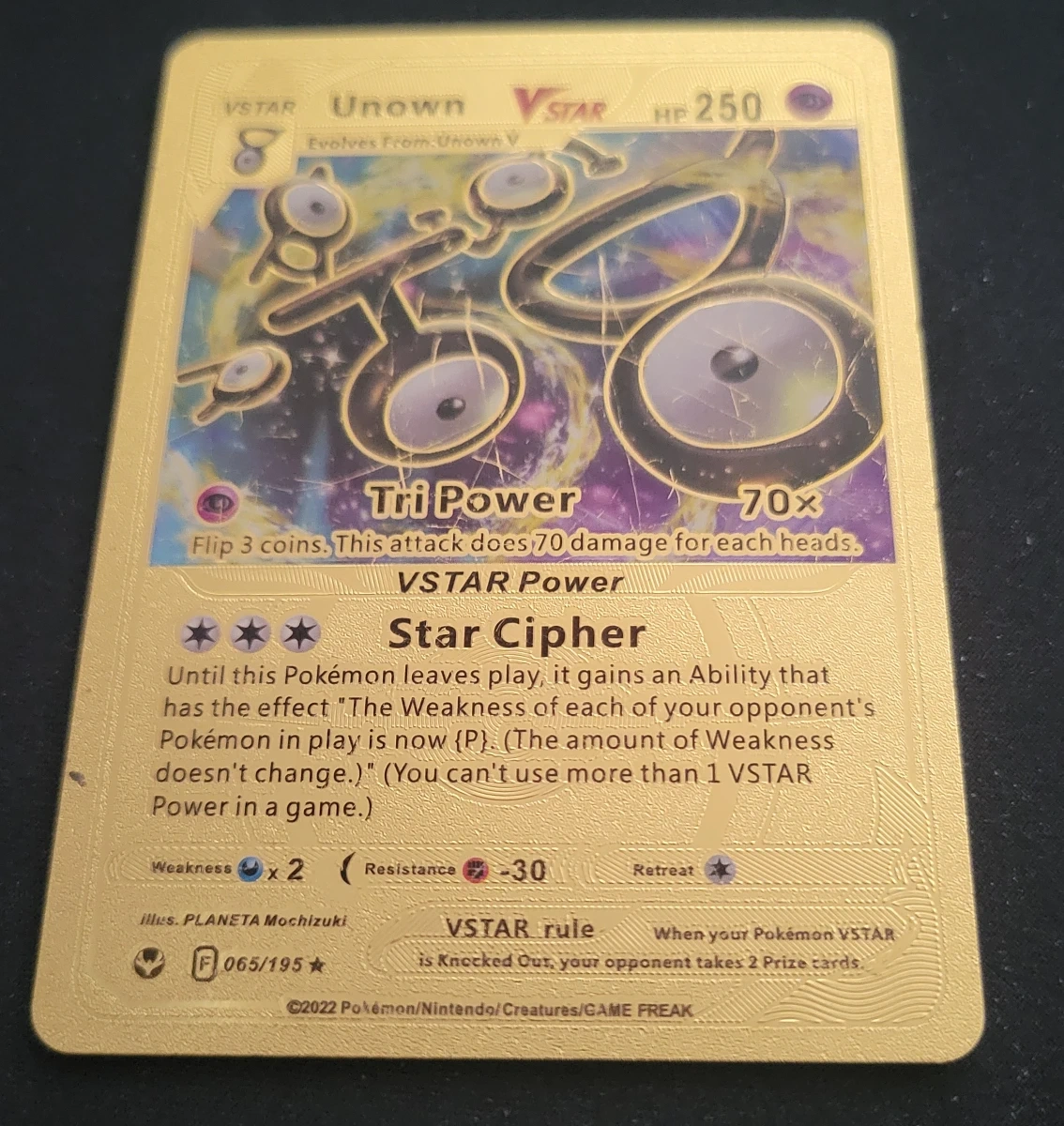 Selling a couple of unique Pokémon cards! These are gold-plated metal cards featuring Pikachu V and Unown VSTAR. They're in good condition and would be a cool addition to any collection!