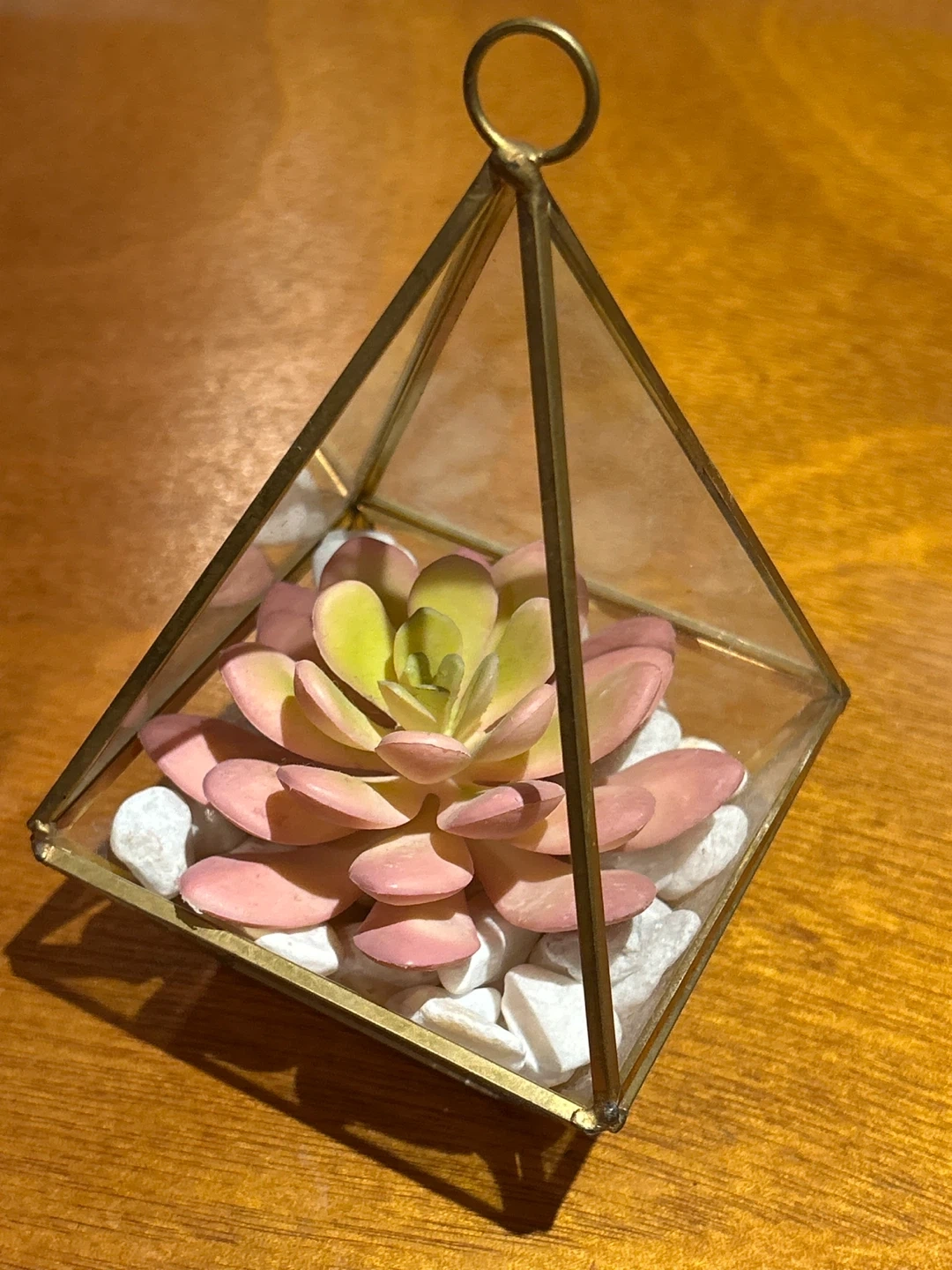 Cute little succulent terrarium! It's in great condition and would look lovely on any shelf or desk. The terrarium is a geometric shape with a gold frame, filled with white stones and a pretty faux succulent.