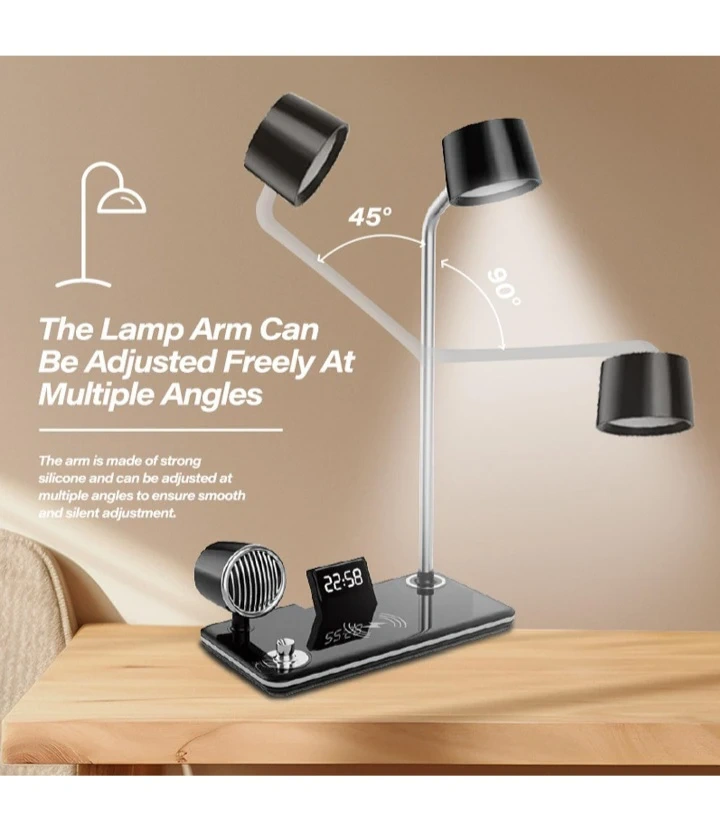 This is a 4 in 1 wireless charger with a built-in BT speaker and lamp! It features 3 color modes and a 15W max output. The lamp arm can be adjusted freely at multiple angles, ensuring smooth and silent adjustment. Included is the USB cable and the original box