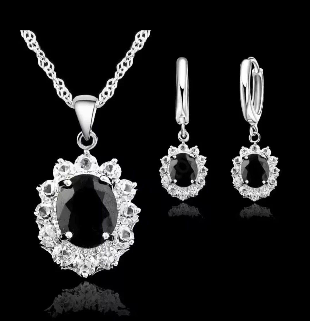 Here's a lovely necklace and earrings set featuring a silver-tone finish and a classic design. The set includes a pendant necklace and matching earrings, perfect for adding a touch of elegance to any outfit! The stones appear to be black and clear.