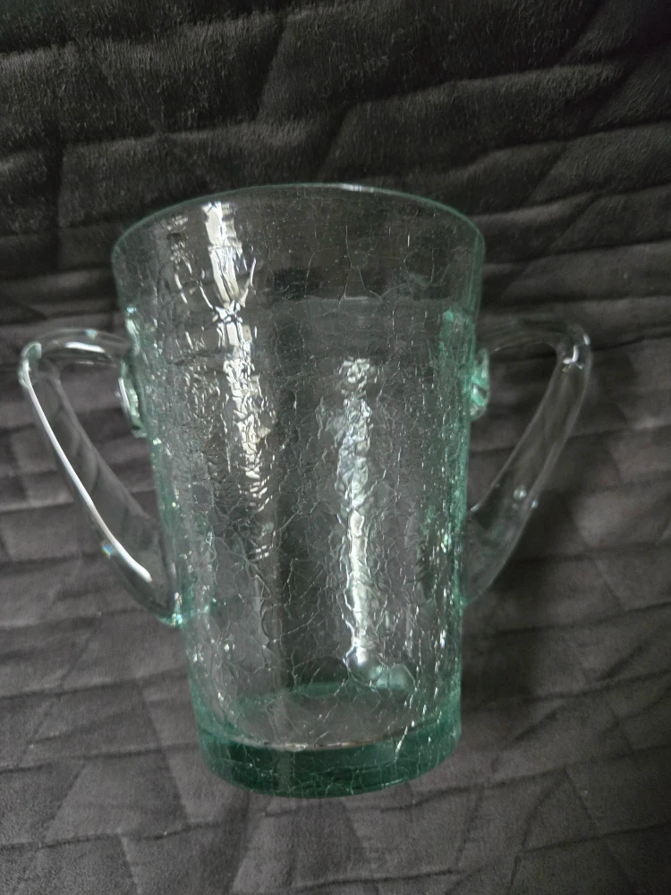 Here's a lovely crackled glass vase with two handles! It stands approximately 7.5 inches tall and has a diameter of about 4 inches at the top. Perfect for adding a touch of vintage charm to your home decor. No chips or cracks, well only the ones that are supposed to be there.. lol...