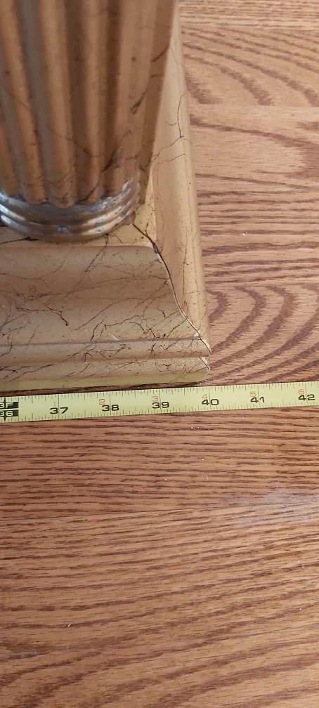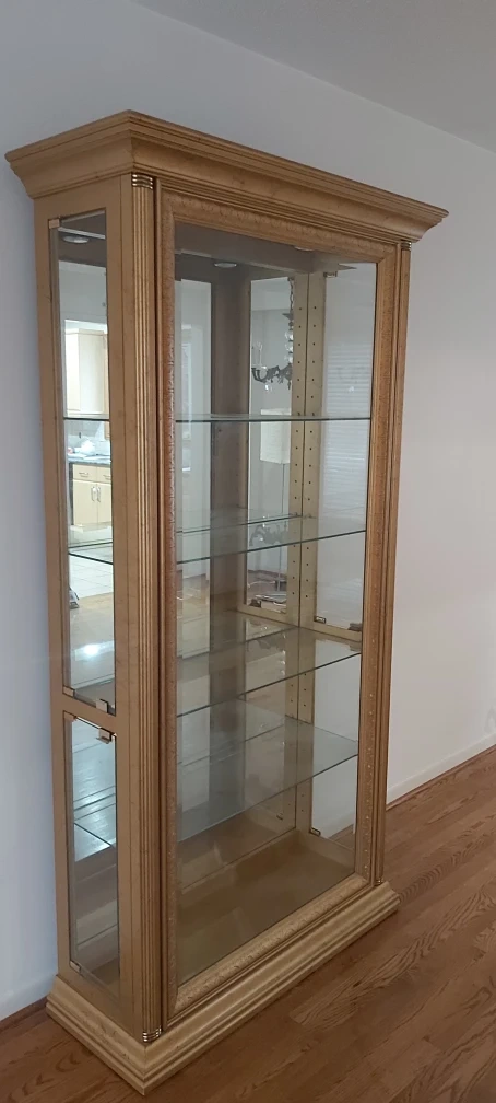 Selling a display cabinet that is gold in colour. It's approximately 80 inches in height and 40 inches wide. From De boer's Furniture Store.