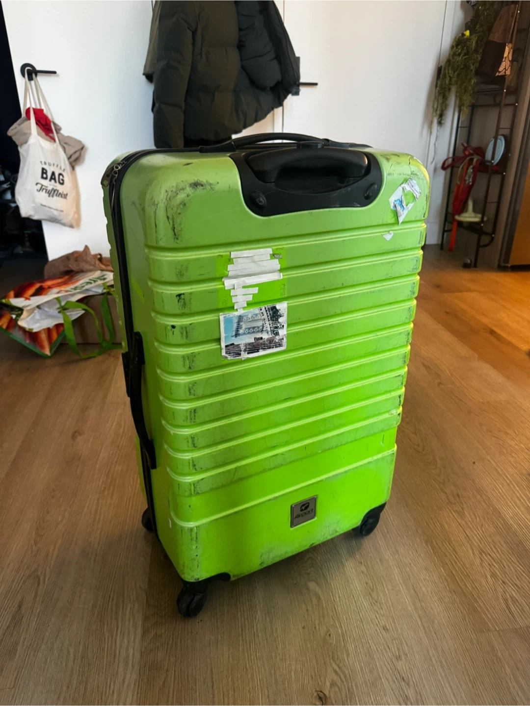 Selling a green carry-on suitcase from Airport. It has some wear and tear, as you can see in the photos. Wheels, handle and zippers are all good.