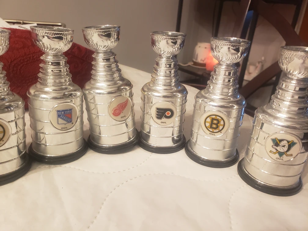 Selling a collection of NHL Stanley Cup 14 in total, replica trophies. These are in great shape and feature various NHL teams. Perfect for any hockey fan! Greatest Goalies hockey cards!