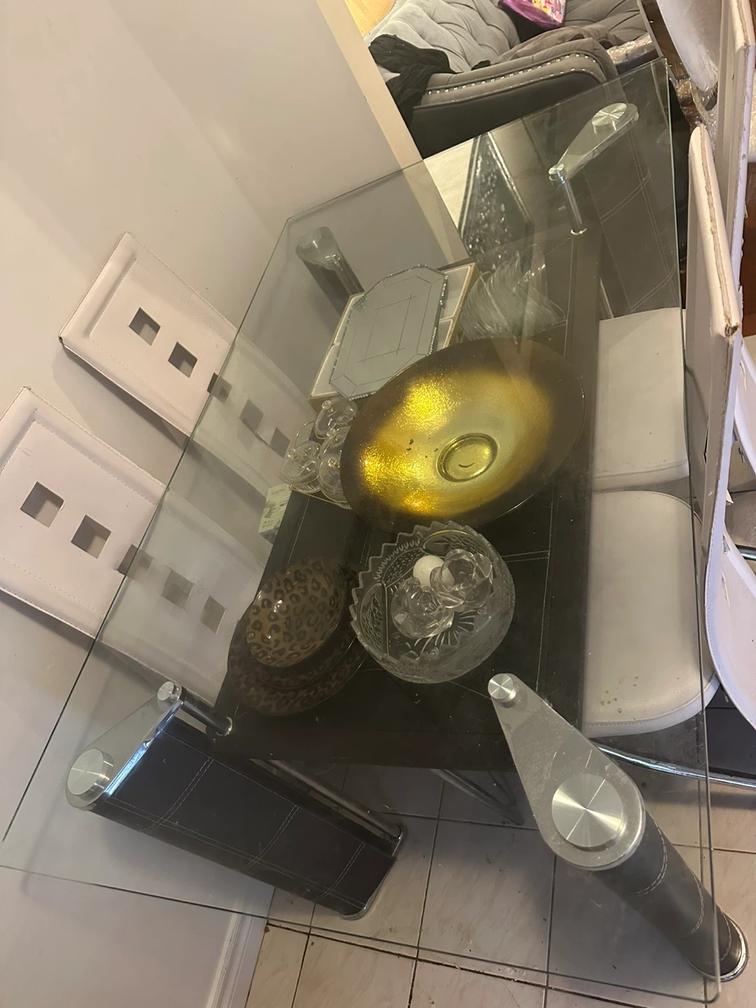 Selling a glass top dining table that comes with four chairs. The table has black accents and the chairs are white. It's a stylish set that would look great in any dining room!