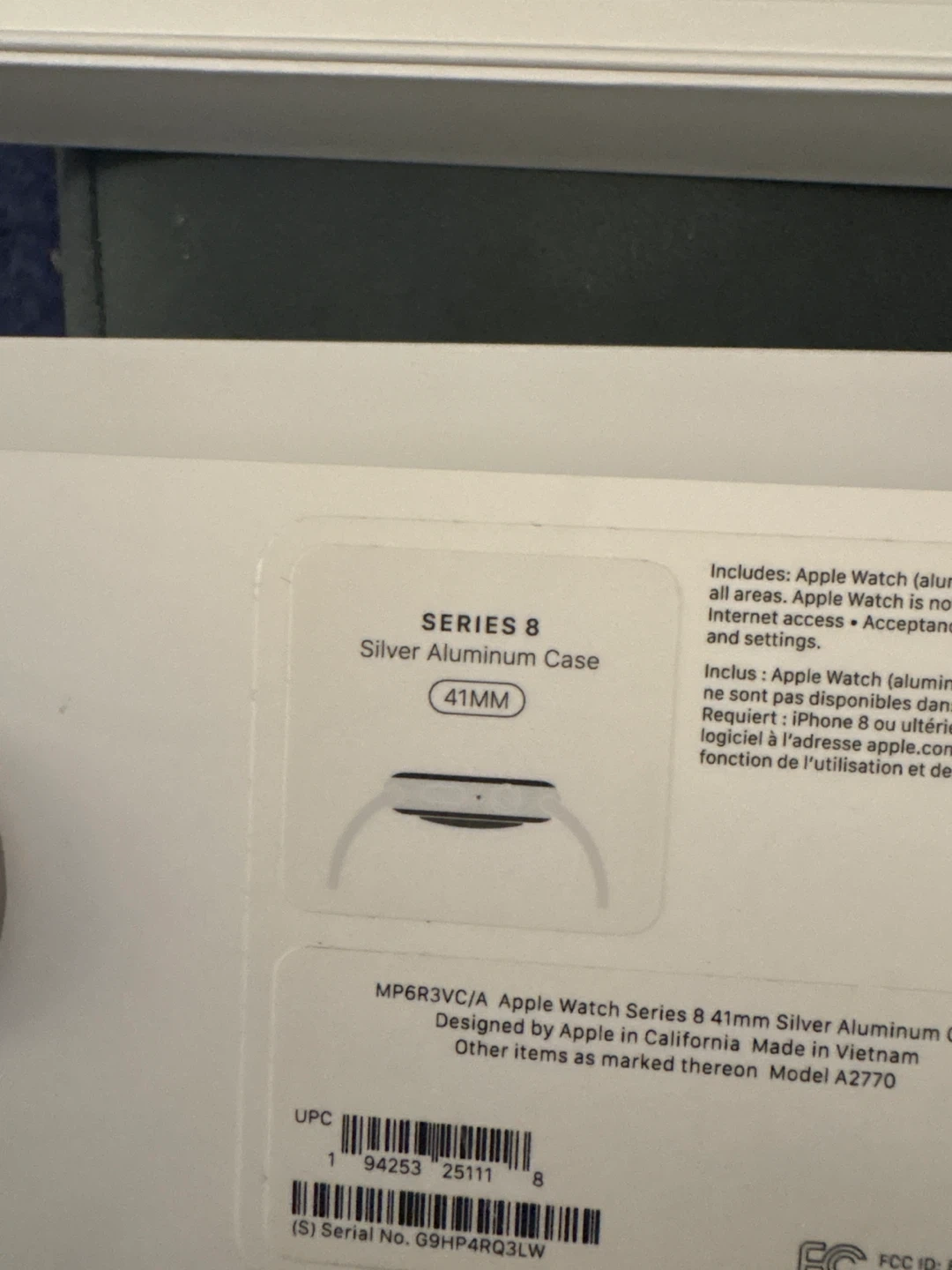 Selling an Apple Watch Series 8 with a silver aluminum case. It's a 41mm size and comes with the box. There are some scratches on the screen, as shown in the photos.