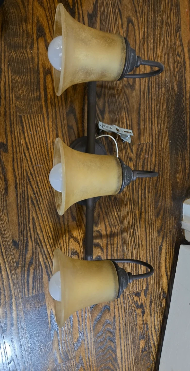 Here's a 3-light bathroom vanity light fixture! It features a bronze finish and frosted glass shades, perfect for adding a warm and inviting glow to your bathroom. It's in great condition and ready to brighten up your space