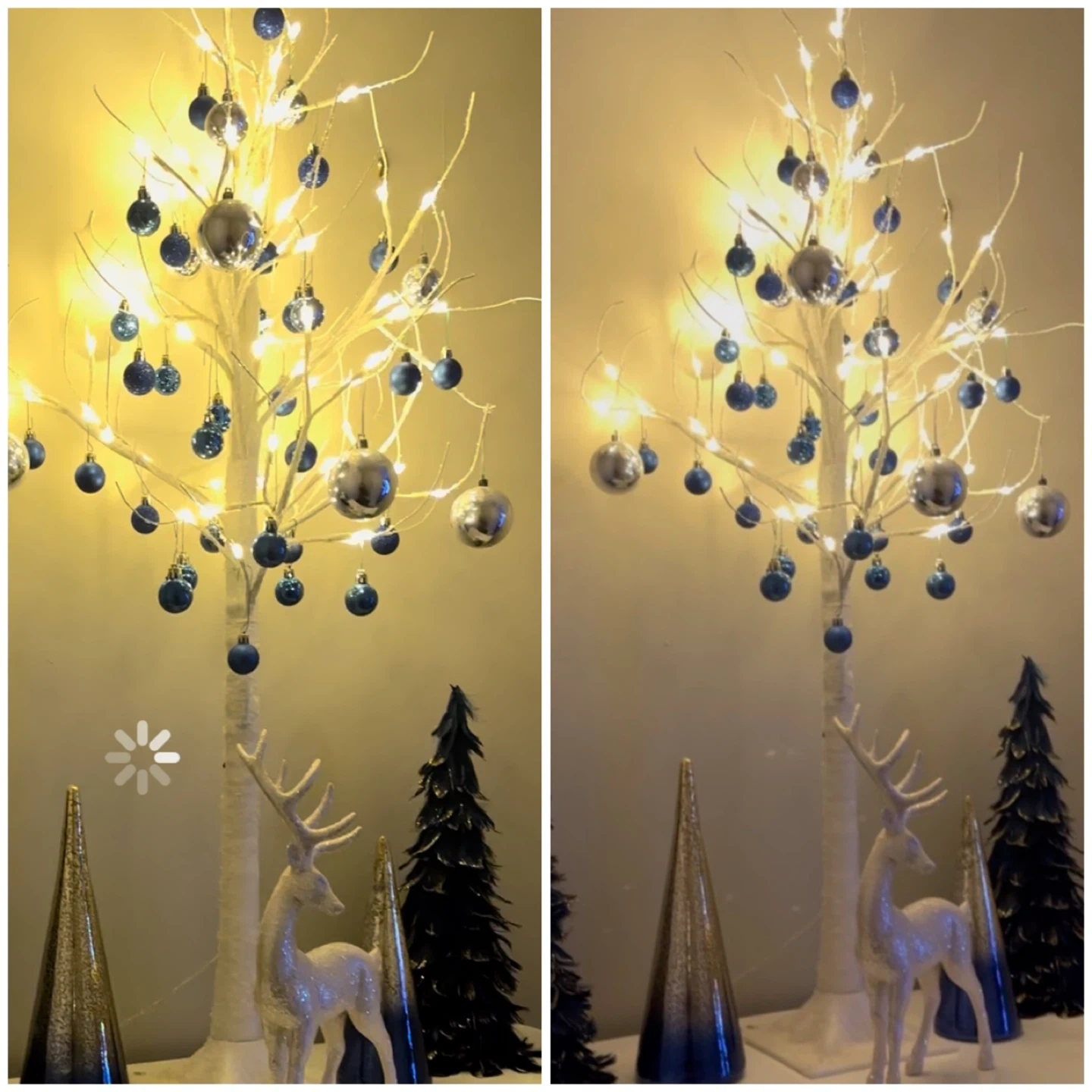 Selling a cute decorated white Christmas tree! It's adorned with silver ornaments and has warm white lights. Perfect for adding a festive touch to any room during the holidays