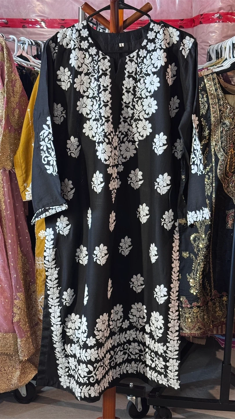 Selling a beautiful black kurta set with white floral embroidery! It's in great condition and perfect for any special occasion or everyday wear. The intricate floral design adds a touch of elegance to the classic black colour. It's a stylish and comfortable outfit!