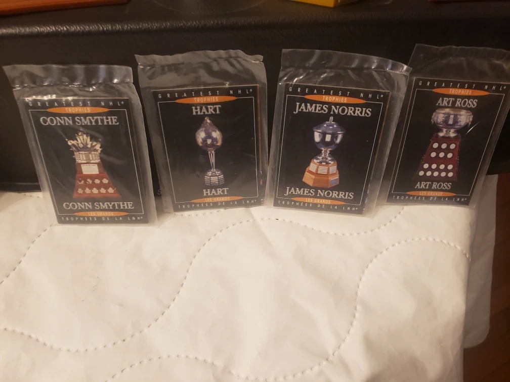 Selling a set of NHL trophy replicas. These are officially licensed products of the NHL and NHLPA. They were manufactured for MeD CORP and made in China. Great for any hockey fan!