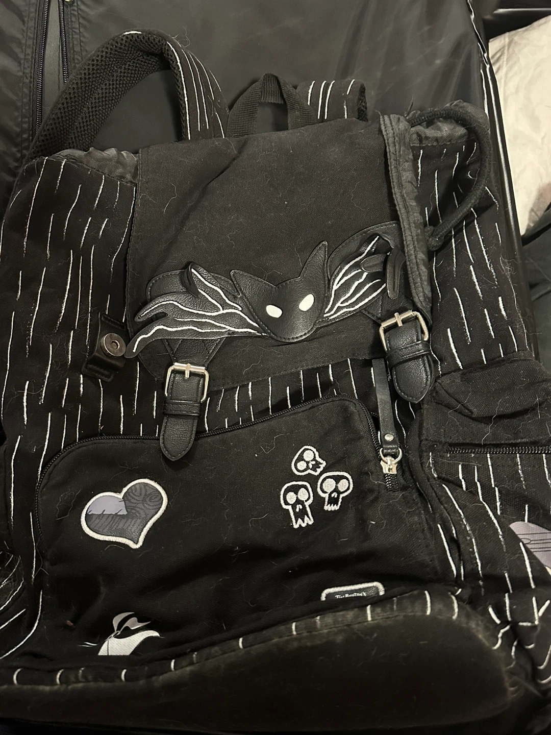 Selling a Nightmare Before Christmas backpack! It's black with white stripes and has some cute patches. Great for fans of the movie!