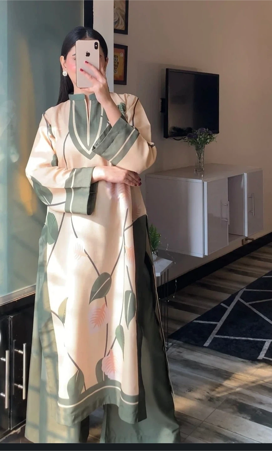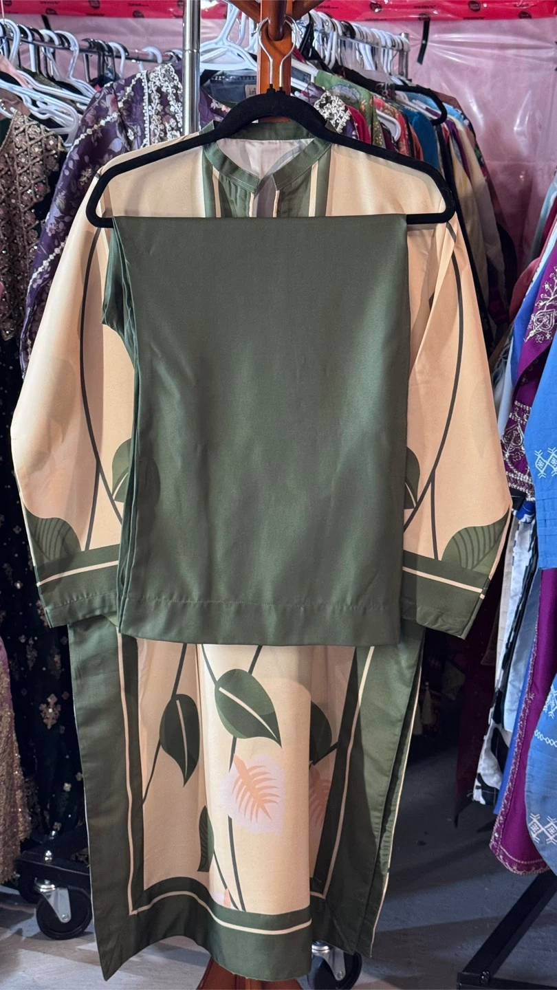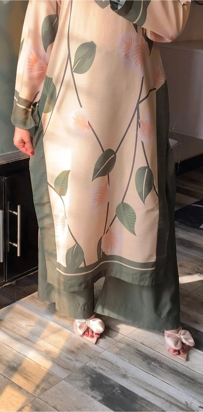 A beautiful floral print pant suit in beige and green. This stylish set is perfect for a special occasion or a chic everyday look. It's in great condition and ready for a new wardrobe! Material is grip silk