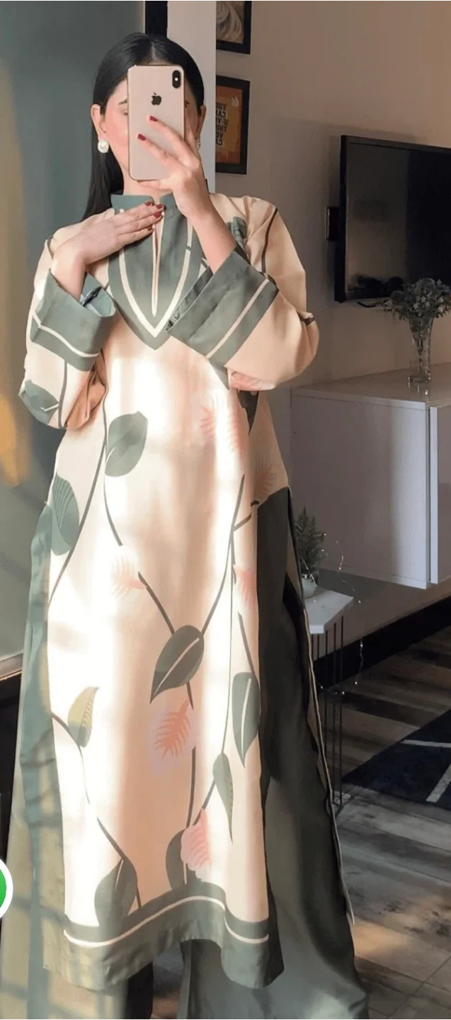 A beautiful floral print pant suit in beige and green. This stylish set is perfect for a special occasion or a chic everyday look. It's in great condition and ready for a new wardrobe! Material is grip silk