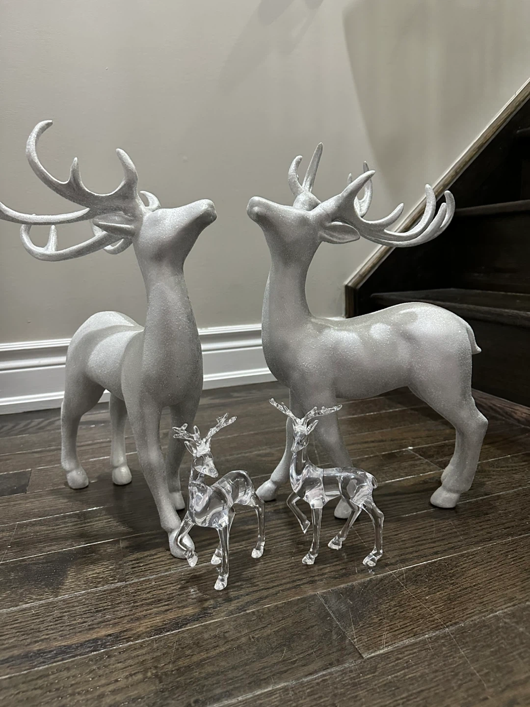 Selling a set of four lovely reindeer figurines! Two are larger and silver, while the other two are smaller and made of clear acrylic. They'd be perfect for adding a touch of festive charm to your home this holiday season