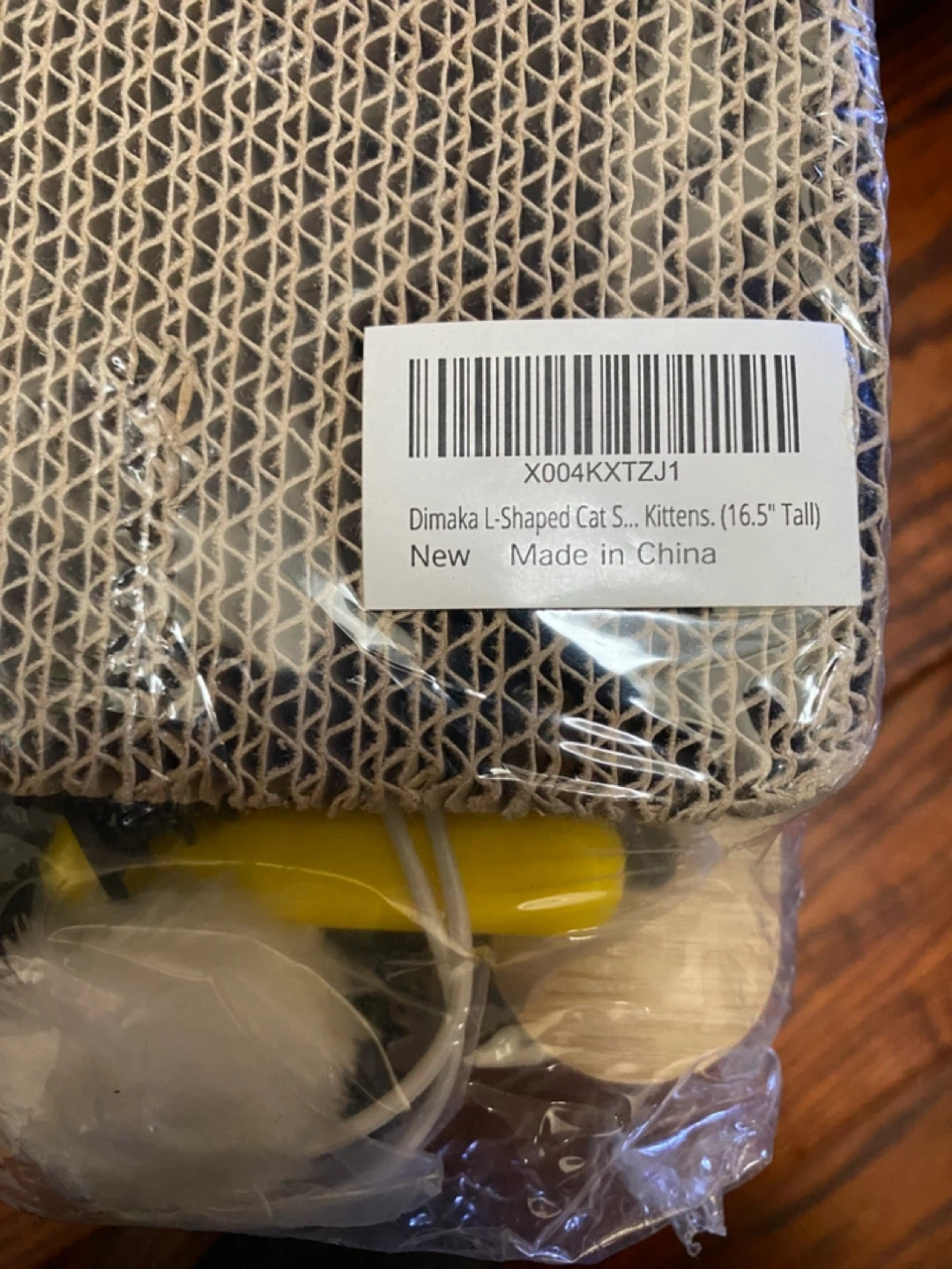 brand new Dimaka L-Shaped Cat Scratcher! It's 16.5 inches tall and comes with some fun cat toys. Still sealed in the original packaging, ready for your furry friend