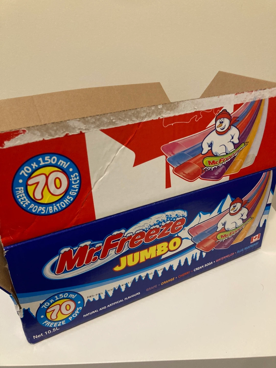 Selling a box of Mr. Freeze Jumbo freeze pops! It comes with 60 pops in a variety of flavours like grape, orange, cherry, cream soda, watermelon, and blue raspberry