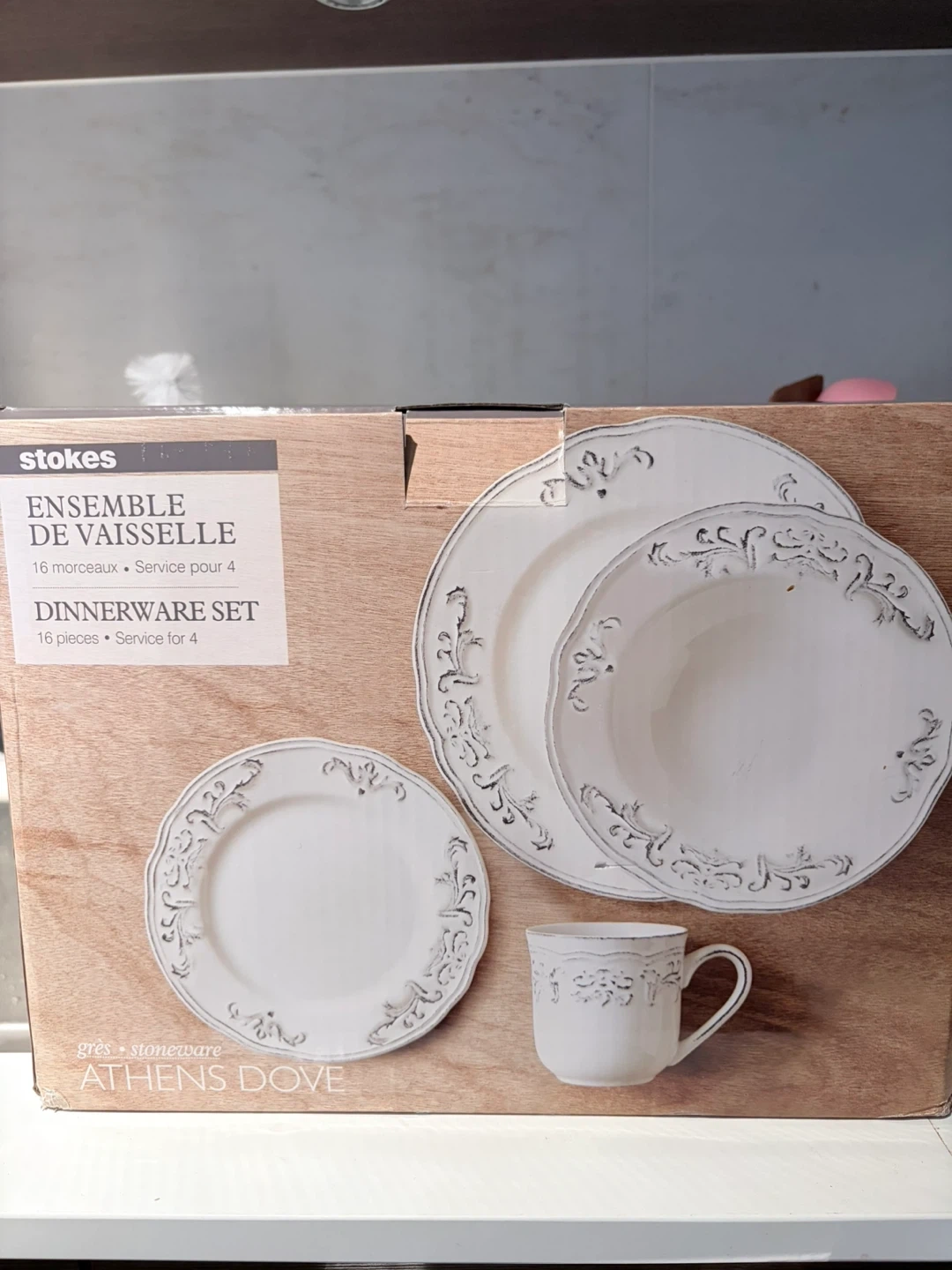 Selling a Stokes Ensemble de Vaisselle, Athens Dove dinnerware set. It's a 16-piece set, service for 4, with a lovely stoneware finish!