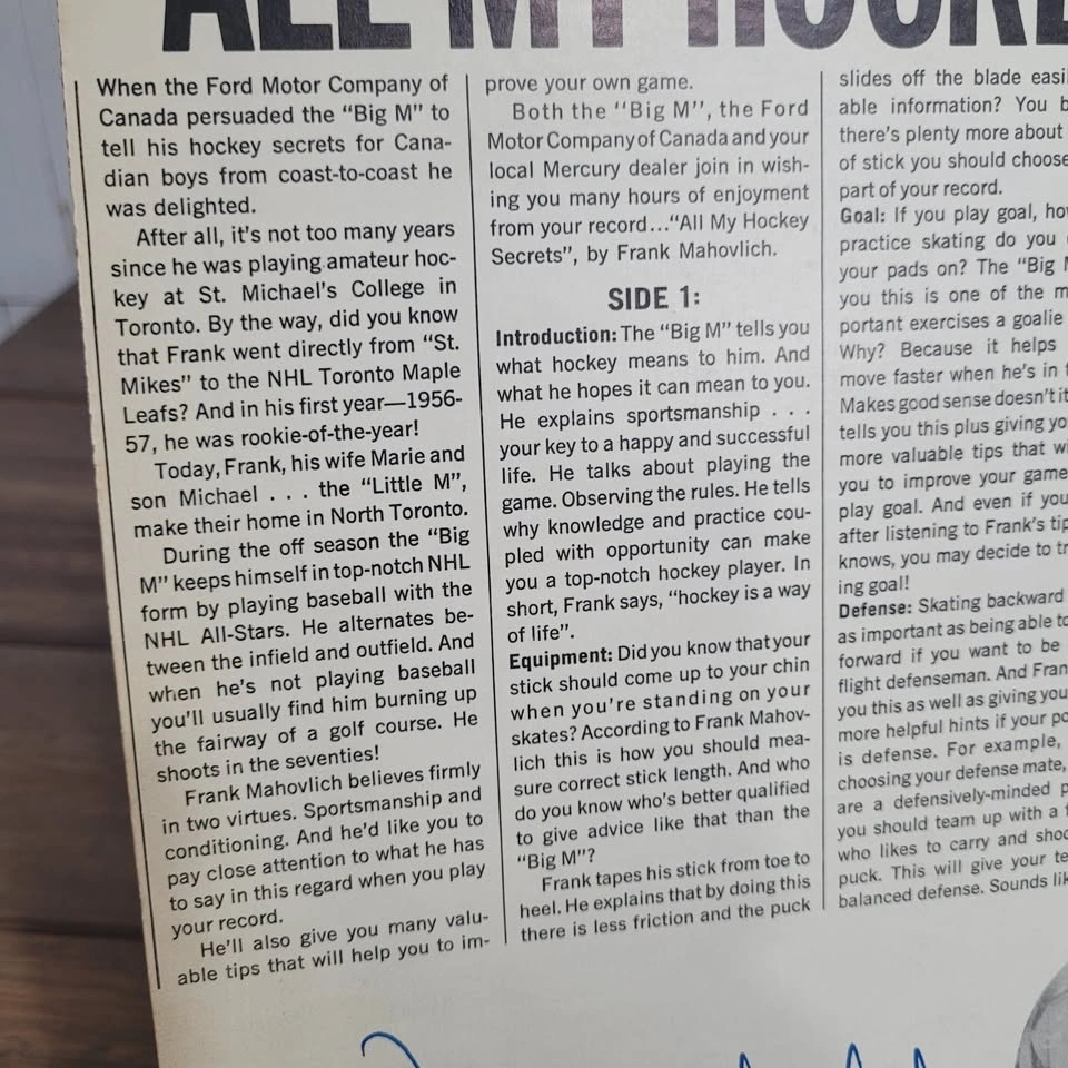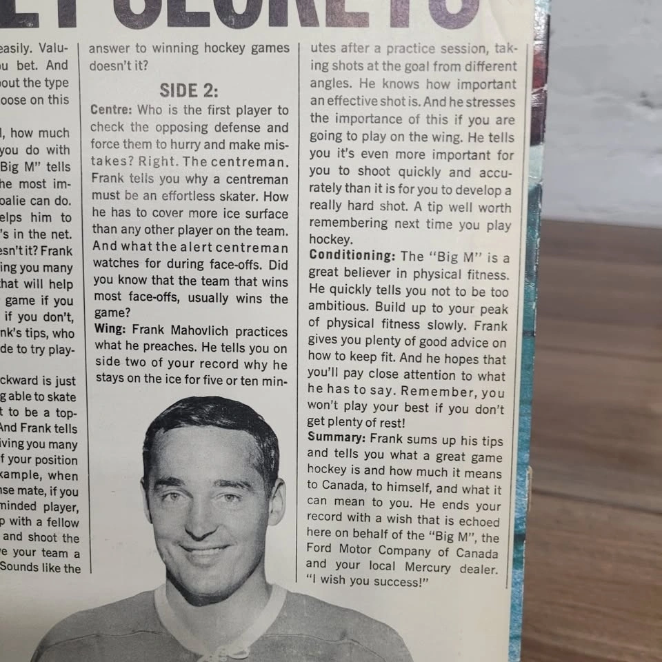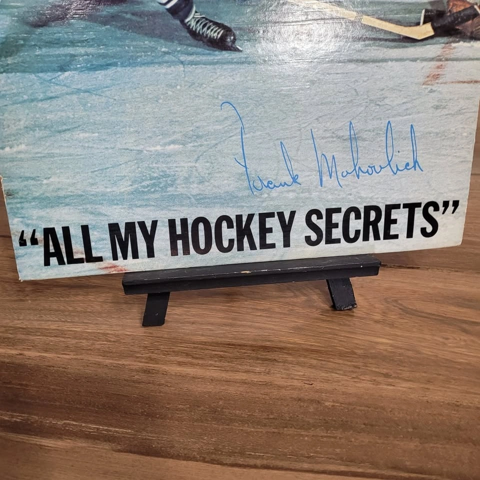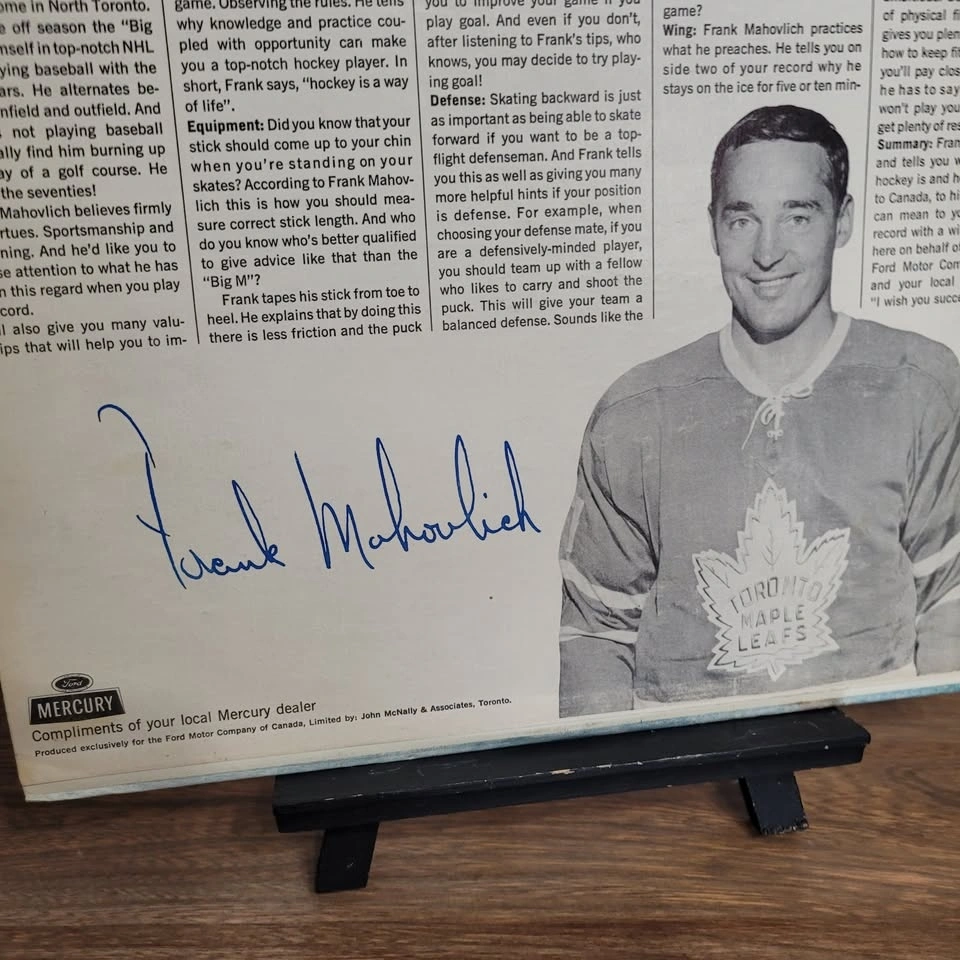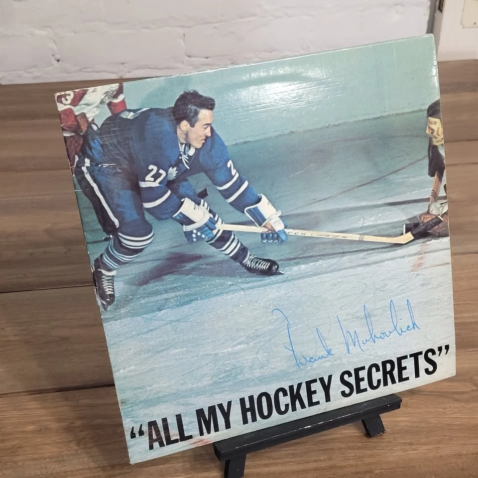 Frank Mahovlich "All My Hockey Secrets" record LP (Audio Commentary record). Please note this is not a music record. Record LP made in 1964 by the Local Mercury Dealer John McNally & Associates in Toronto, Ontario, and the Ford Motor Company. Printed signed autograph of Frank Mahovlich on the front and back cover. (see photos)
