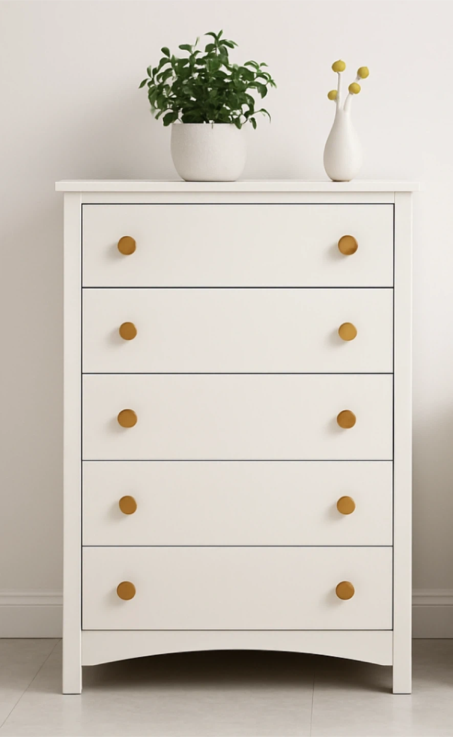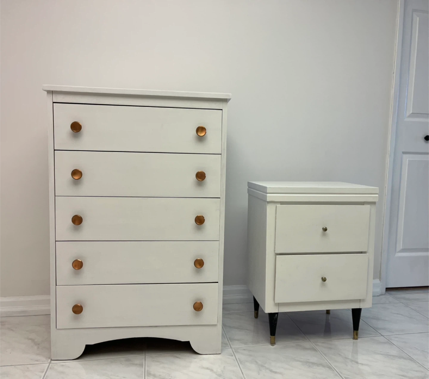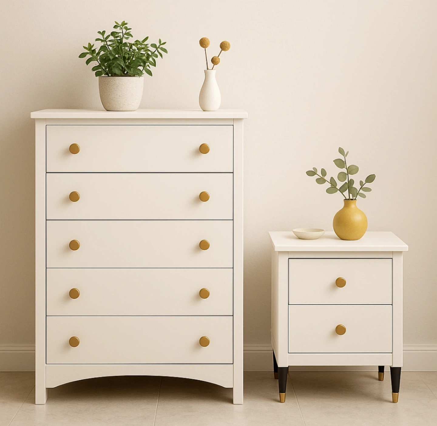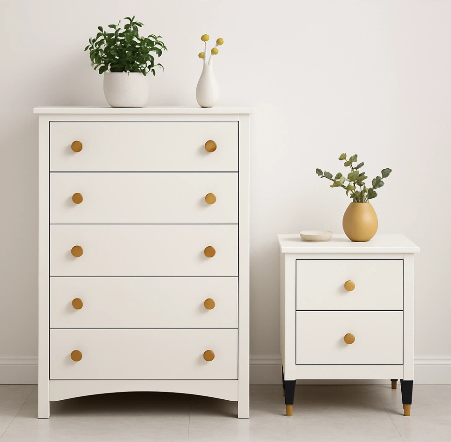 This beautiful matching set is handmade, giving it a warm, personal touch that you don’t get from mass-produced furniture. Both pieces are solid, sturdy, and painted in a clean white finish with simple gold knobs that brighten any bedroom.