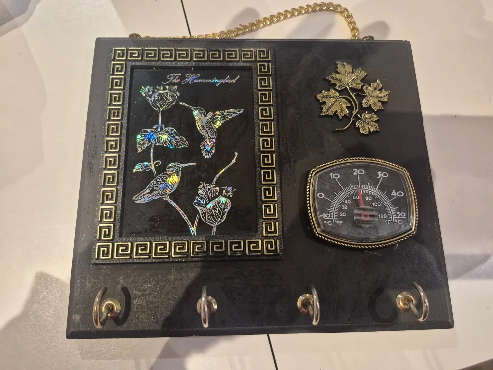 Cute wall decor featuring a hummingbird design and a built-in thermometer! It also has hooks at the bottom for hanging things. Perfect for adding a touch of charm to any room
